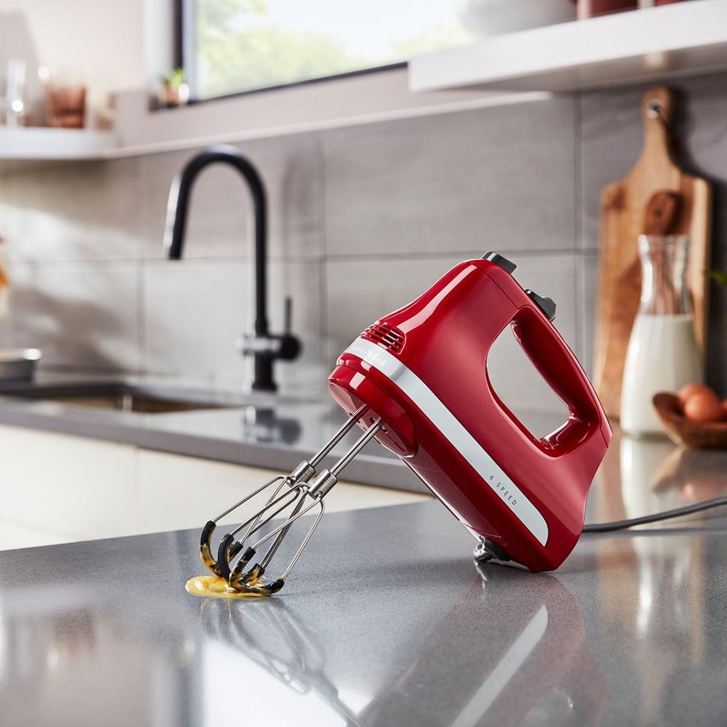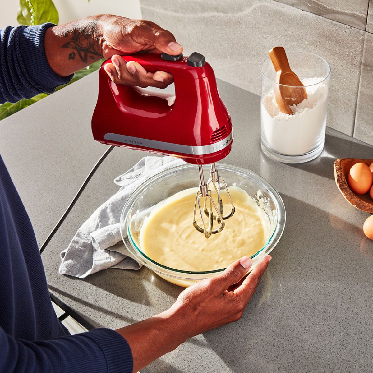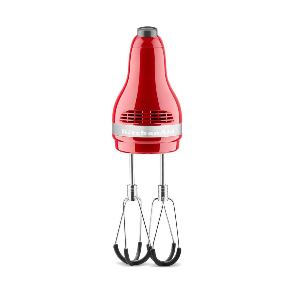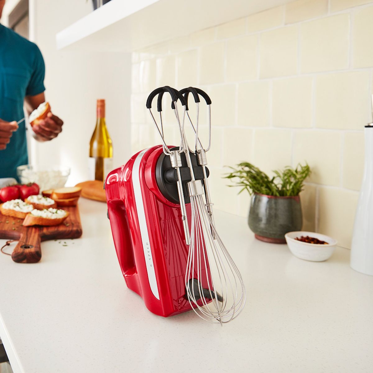La Batidora amasadora 5KHM6118 KitchenAid es un aliado imprescindible en la cocina por su reducido tamaño y su gran versatilidad. Con el elegante diseño que caracteriza a la marca y su clásico color rojo, con esta batidora amasadora de mano podrás conseguir grandes resultados en muy poco tiempo al batir, montar, mezclar y remover. Equipada con un batidor de 8 varillas y dos batidores de borde flexible, no habrá masa que se te resista ni se quede pegada en las paredes del bol.