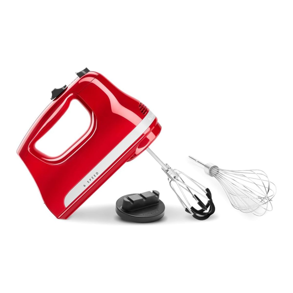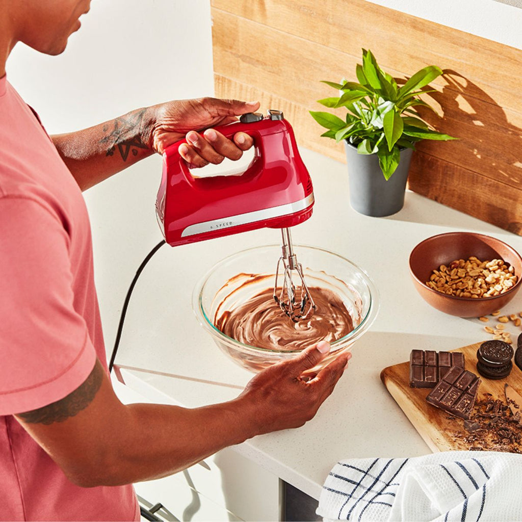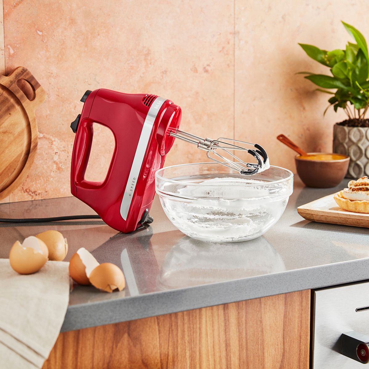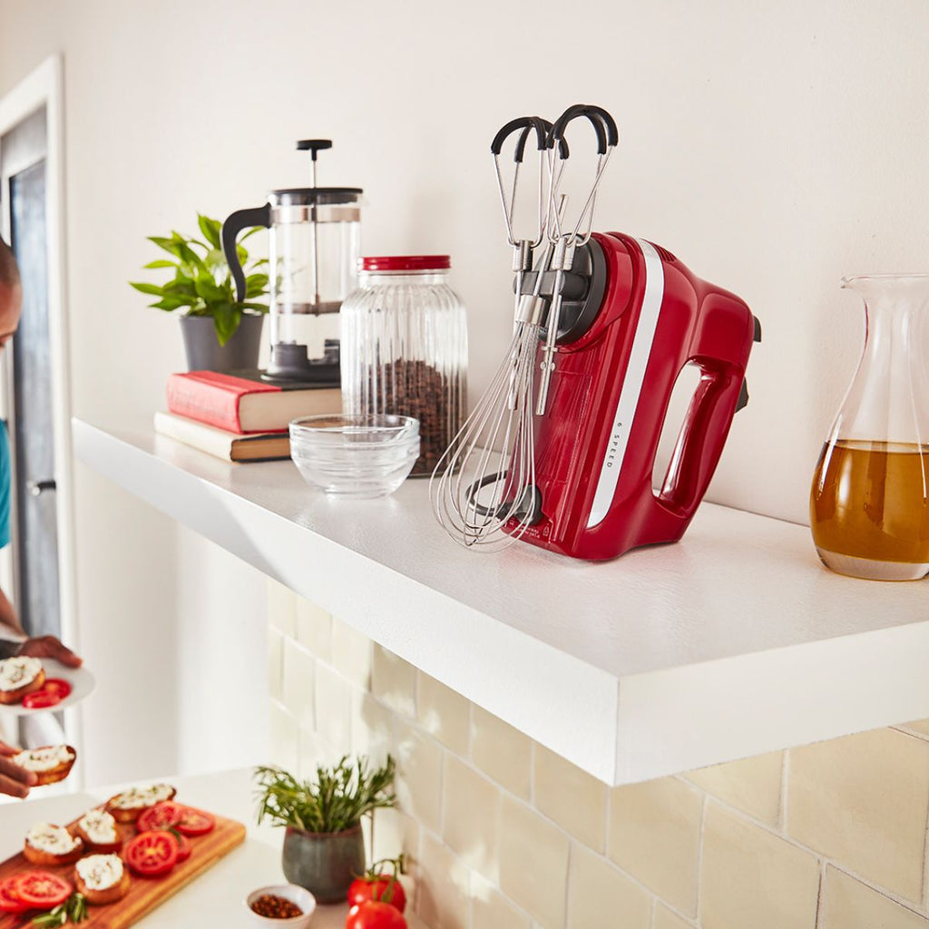 La Batidora amasadora 5KHM6118 KitchenAid es un aliado imprescindible en la cocina por su reducido tamaño y su gran versatilidad. Con el elegante diseño que caracteriza a la marca y su clásico color rojo, con esta batidora amasadora de mano podrás conseguir grandes resultados en muy poco tiempo al batir, montar, mezclar y remover. Equipada con un batidor de 8 varillas y dos batidores de borde flexible, no habrá masa que se te resista ni se quede pegada en las paredes del bol.
