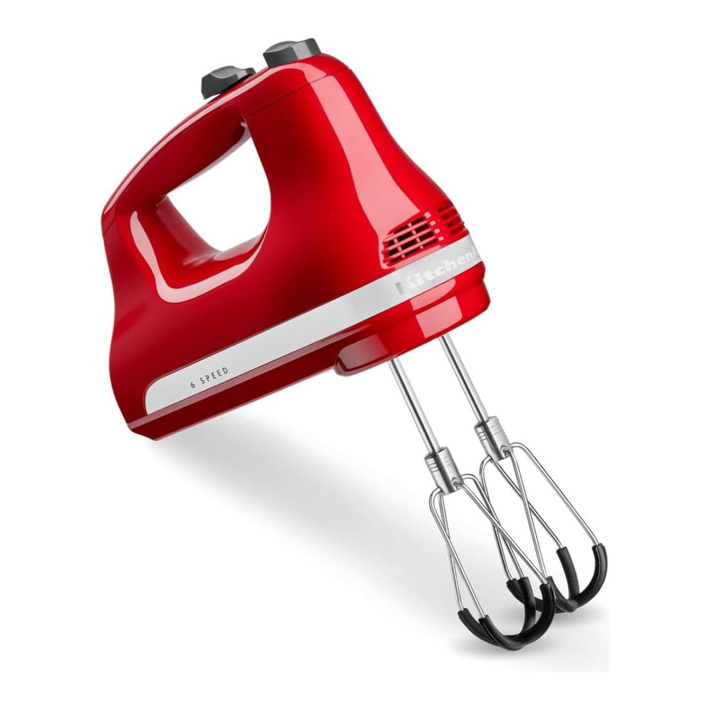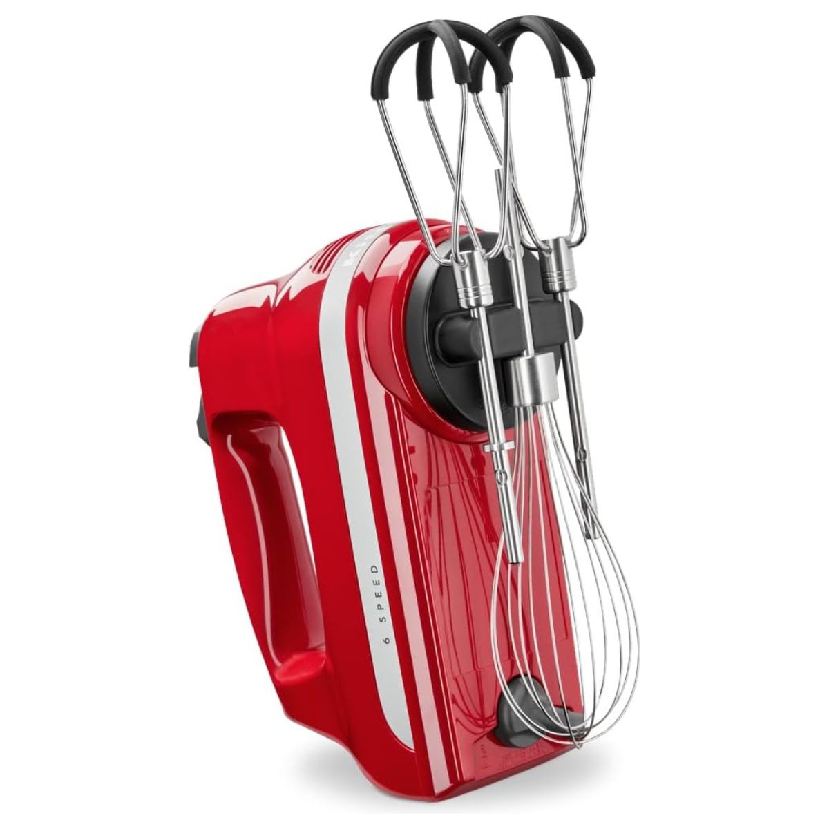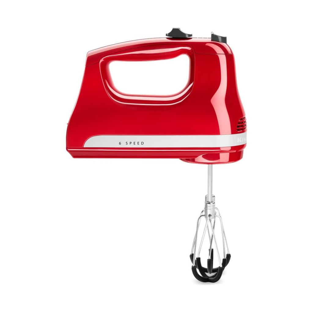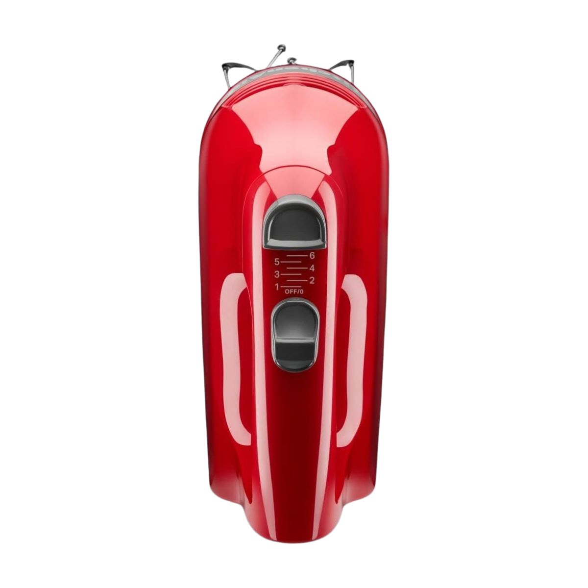La Batidora amasadora 5KHM6118 KitchenAid es un aliado imprescindible en la cocina por su reducido tamaño y su gran versatilidad. Con el elegante diseño que caracteriza a la marca y su clásico color rojo, con esta batidora amasadora de mano podrás conseguir grandes resultados en muy poco tiempo al batir, montar, mezclar y remover. Equipada con un batidor de 8 varillas y dos batidores de borde flexible, no habrá masa que se te resista ni se quede pegada en las paredes del bol.