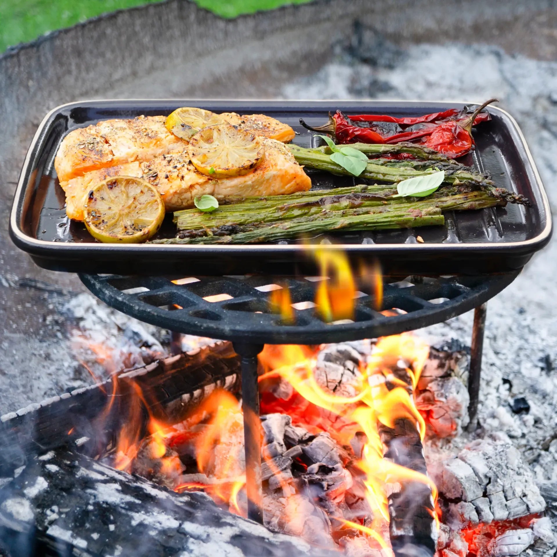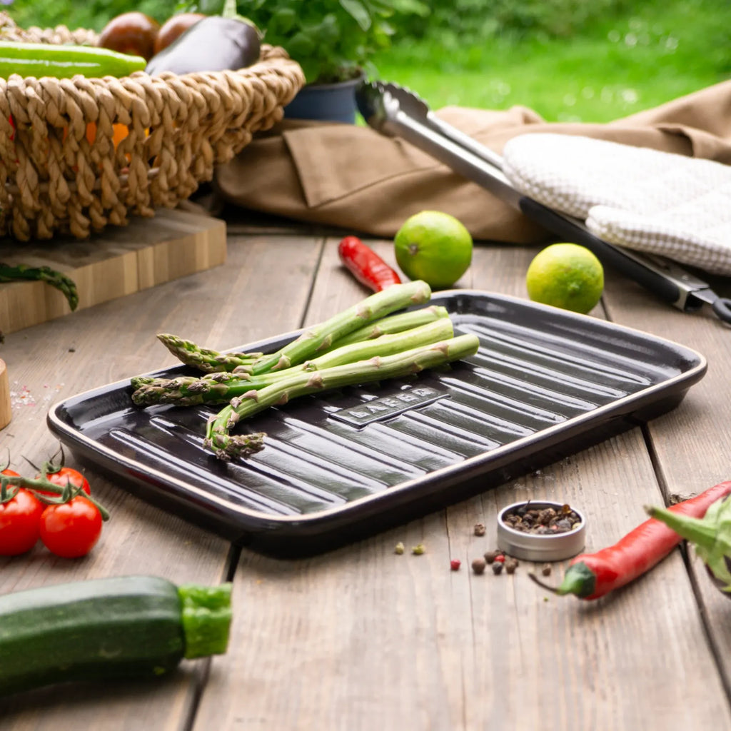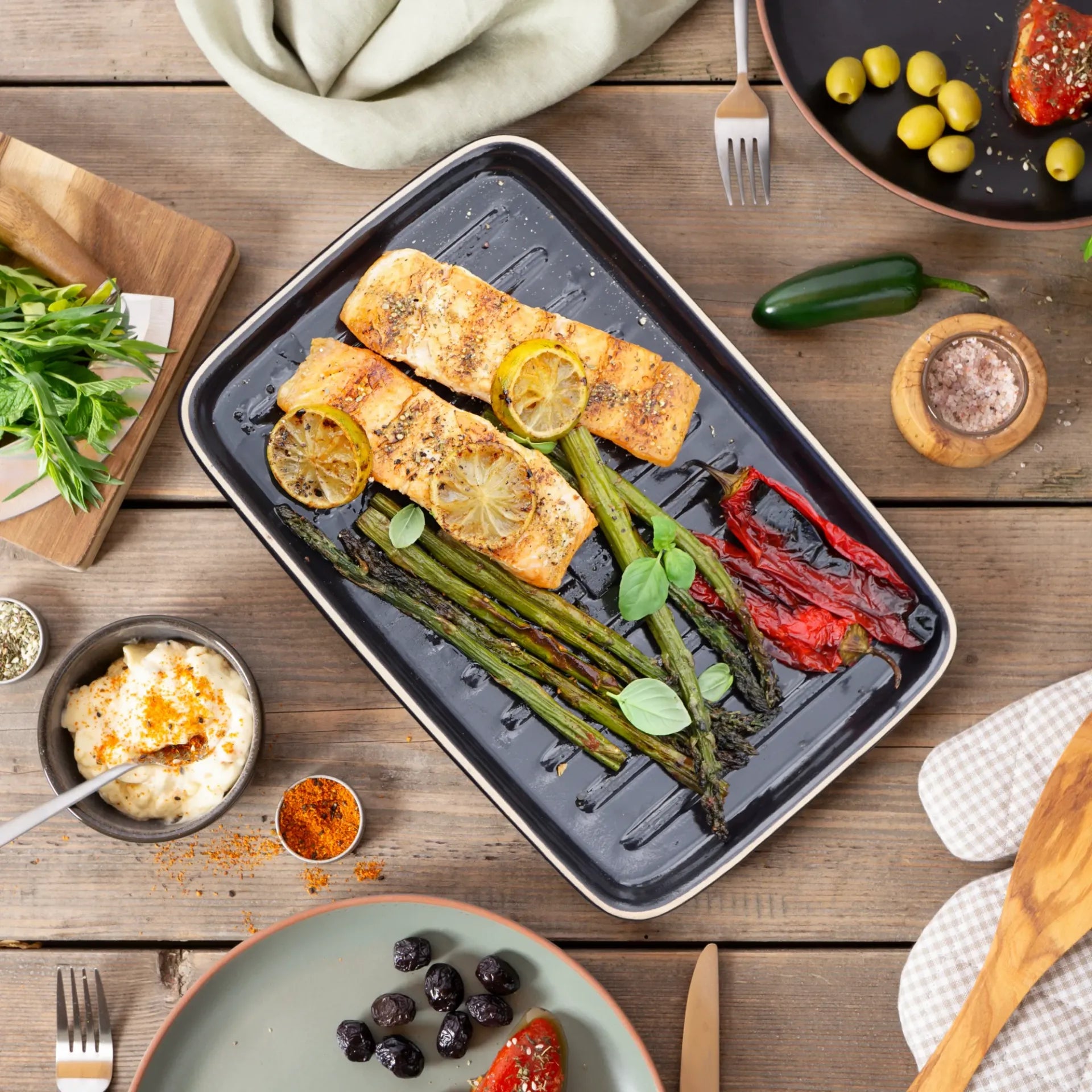 Elegante, robusta y sostenible, su superficie de 33 x 22 cm ofrece un espacio de cocción estupendo. Su ligera altura es perfecta para retener los alimentos y mantener sus jugos. El resultado es increíblemente jugoso por dentro y dorado y crujiente por fuera. Una vez esté todo asado, lleva la parrilla a la mesa, porque no hay mejor bandeja para presentar lo que has cocinado, manteniéndolo caliente por más tiempo.
