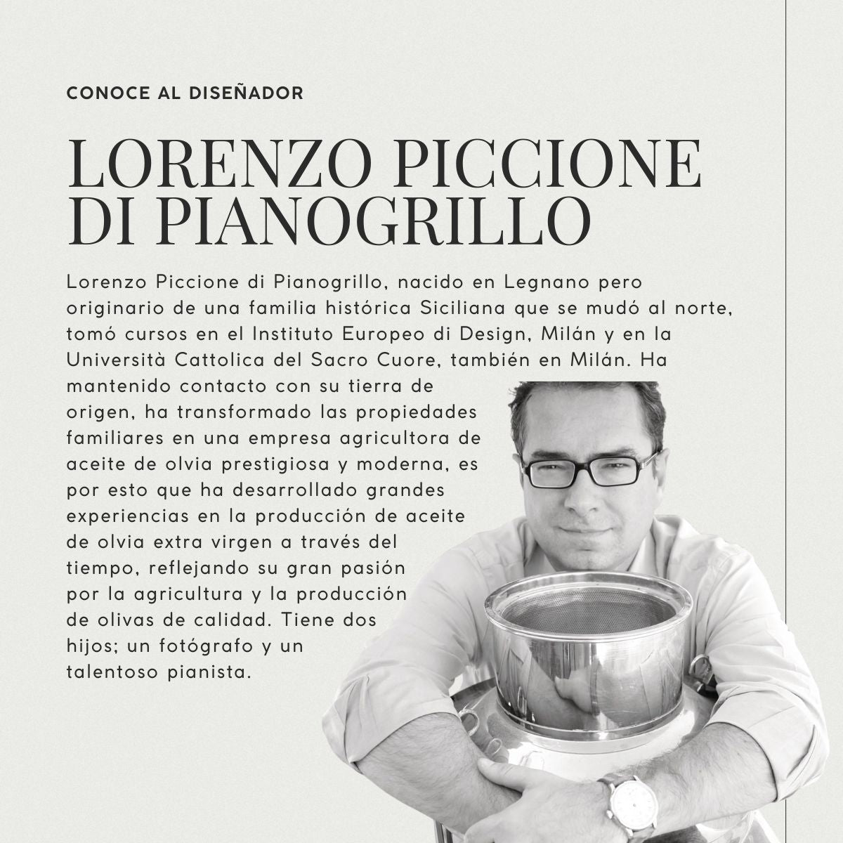 Este catador de aceite es toda una obra de arte fruto de la imaginación de dos genios como Lorenzo Piccione di Pianogrillo y Köbi Wiesendanger. El primero desde pequeño ha tenido contacto con el cultivo de los olivos y la producción de aceite porque nació en Sicilia. El segundo, de origen suizo, se dedica al diseño de objetos y muchas de sus obras son exhibidas en museos de prestigio.