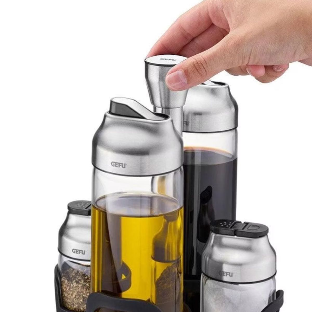 Organiza, sirve y aliña sin esfuerzo con el Set de aceitera, vinagrera y especieros Kippo Gefu. Su práctico carrusel giratorio mantiene todo perfectamente ordenado y siempre a mano, para que puedas condimentar y dar el toque final a tus platos con total comodidad.