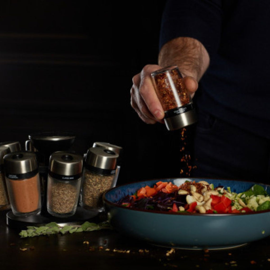 El Soporte para 8 recipientes para especias Cambridge Cole&Mason es la solución perfecta para mantener tus hierbas y especias organizadas de manera práctica en la cocina. Este accesorio combina un diseño moderno y cómodo que te permite acceder rápidamente a tus ingredientes favoritos y especiar tus platos mientras cocinas. ¡Vienen llenos! Sí, los frascos vienen con una selección de las mejores especias y, cuando lo requieras, podrás rellenarlos de nuevo superfácilmente!