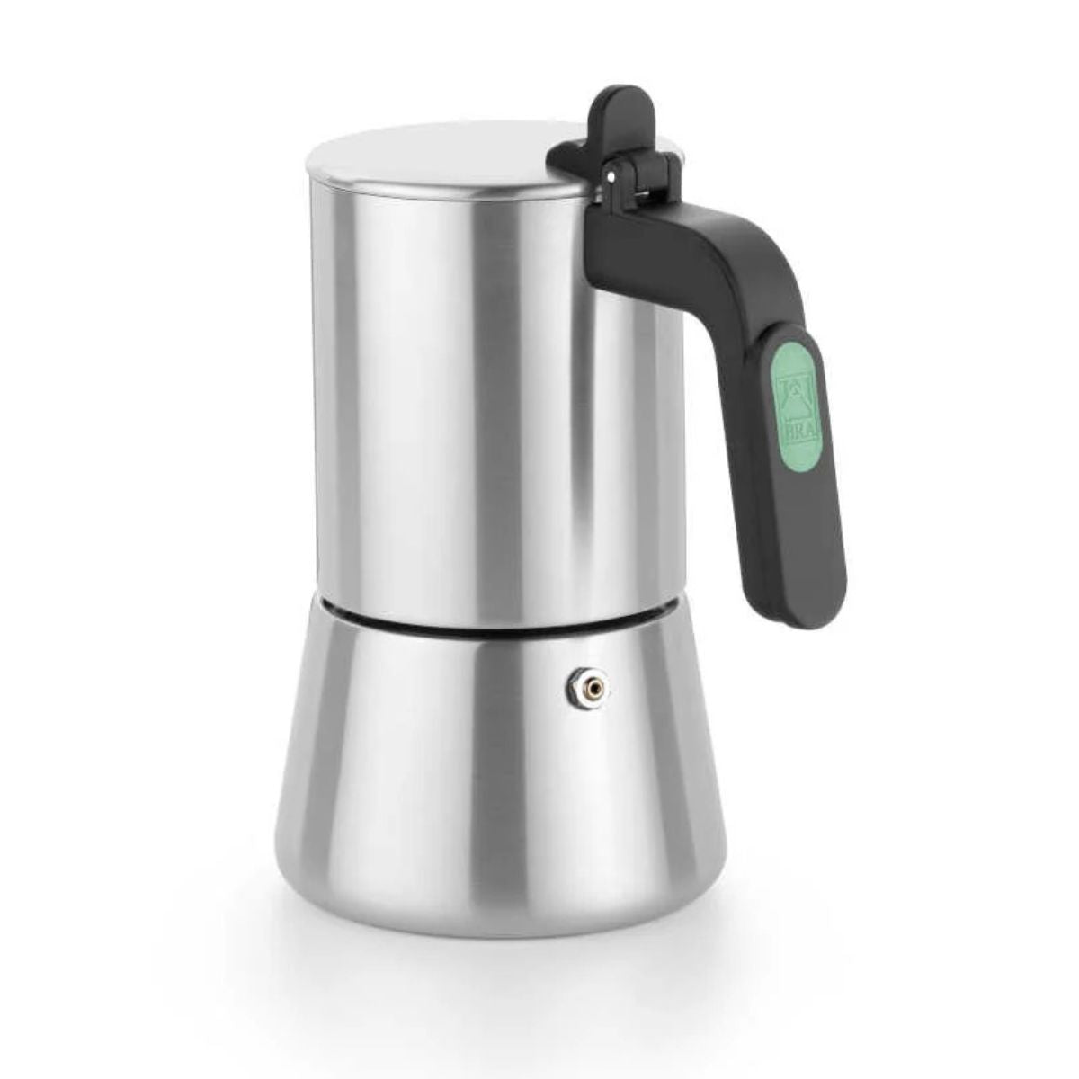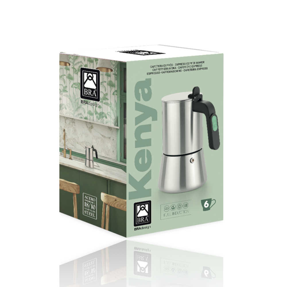 La Cafetera Kenia Bra te permitirá preparar un café lleno de sabor, mientras su aroma inunda la cocina. Esta cafetera italiana está fabricada en acero inoxidable de alta calidad y resistencia al desgaste. Su elegante diseño cónico destaca por su amplia base, que junto con su fondo difusor full induction, garantiza mayor funcionalidad en todas las cocinas, incluida la inducción.
