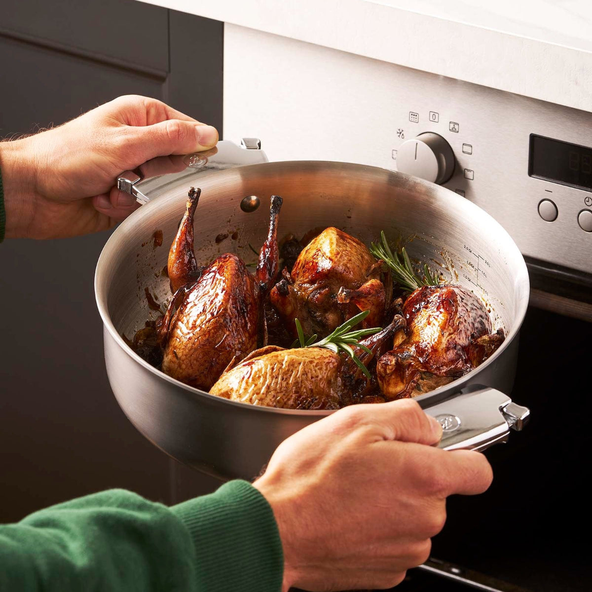 Cazuela, sauté o rustidera, ¡tú eliges! Con el Cazo bajo de acero inoxidable Alchimy Loqy de De Buyer los tendrás todos en una única pieza con solo un clic. La novedosa gama Loqy De Buyer con mangos y asas intercambiables, te permitirá rustir, freír, saltear, guisar o asar con un solo cuerpo de acero inoxidable multicapa, encajando el mango o las asas. Y ocupará el mínimo espacio cuando no lo uses.