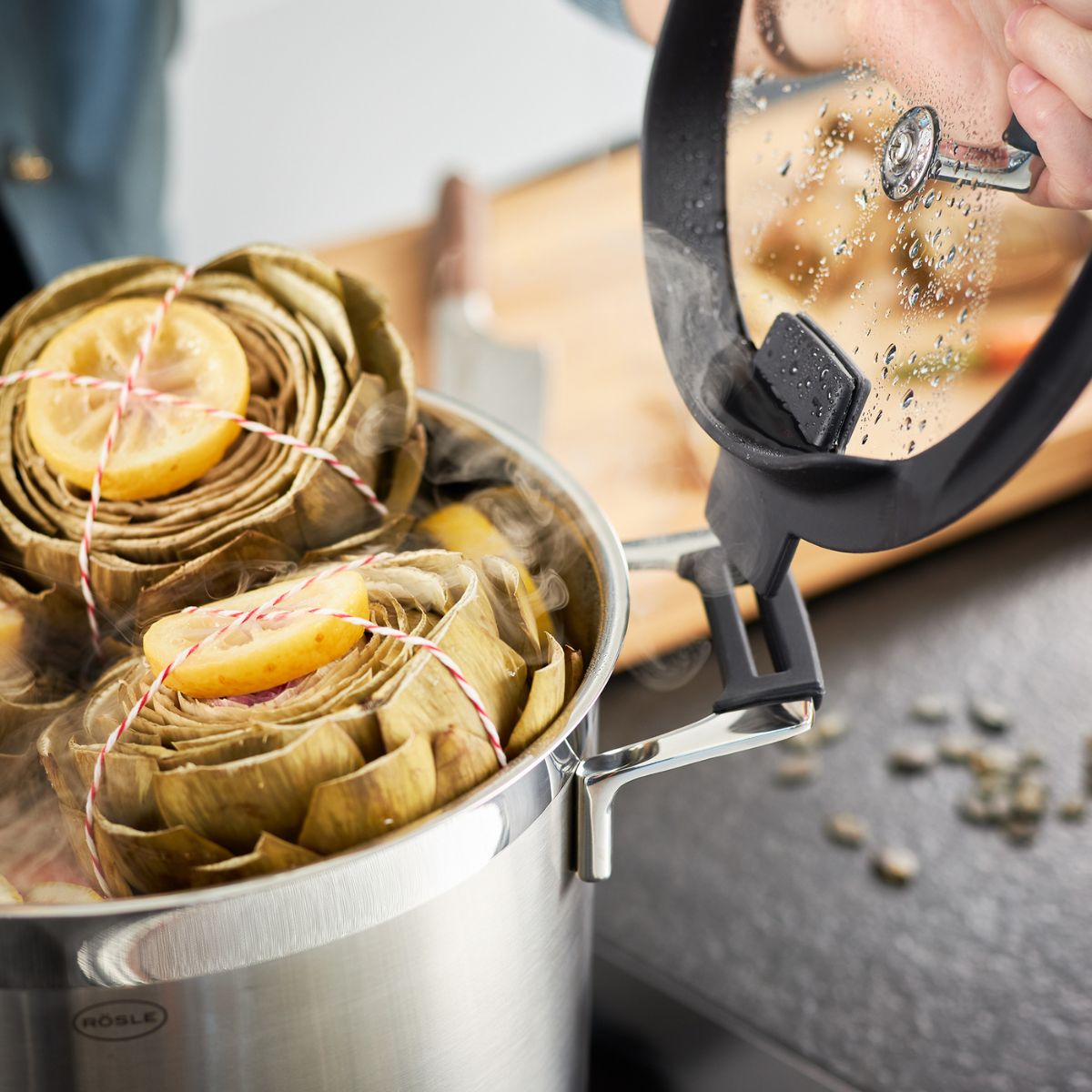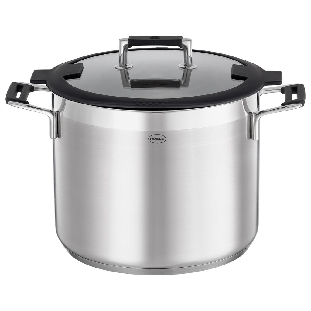 La elegante sencillez del diseño de la Olla de acero inoxidable con tapa de cristal Silence Pro Rösle permite destacar todas sus funciones inteligentes. Presta atención, porque en esta olla alta de acero inoxidable, cada detalle es importante. Desde la base difusora, que calienta de forma estupenda, hasta la tapa de cristal, que encaja en el asa de la olla sin gotear, todo ha sido diseñado para que cocinar con ella sea mucho más fácil, cómodo y limpio.