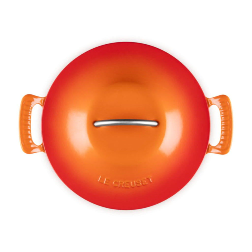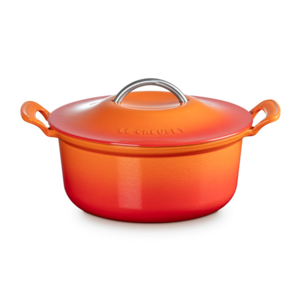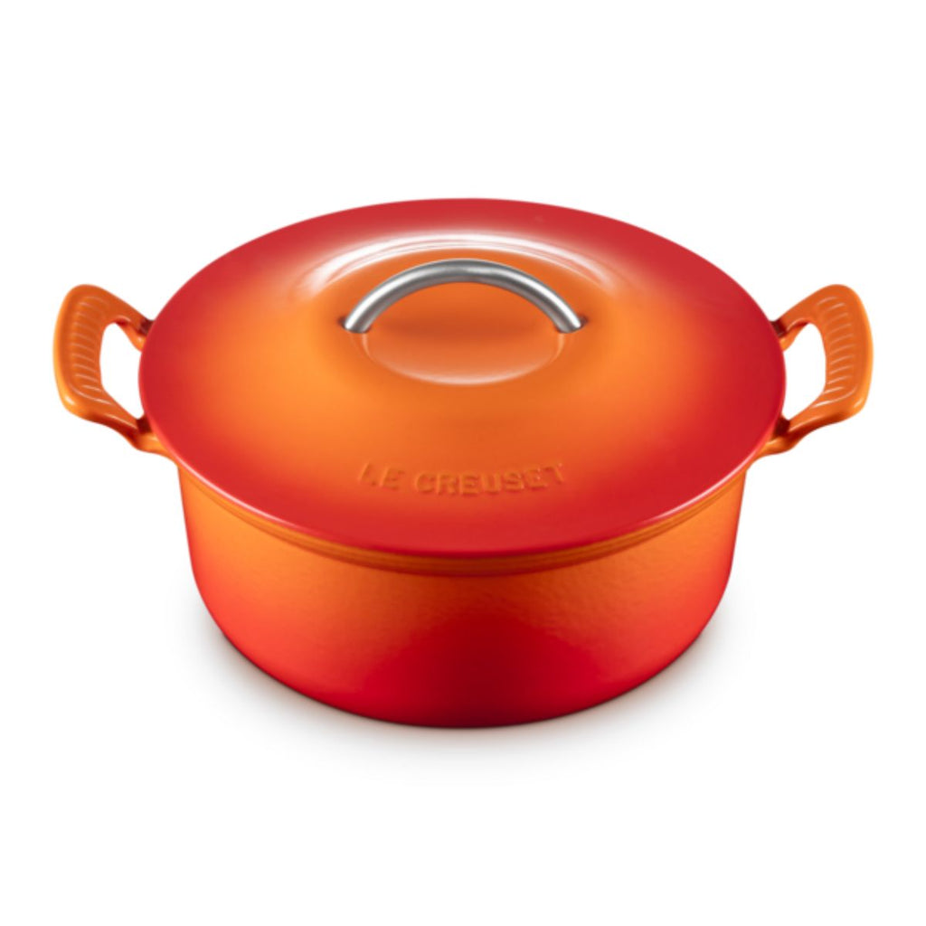 La cocotte redonda de hierro fundido Modern Heritage se distingue por su diseño de aire retro, en el que destacan sus asas acanaladas abiertas y elevadas, que ayudan a un manejo cómodo y seguro, y el asa metálica de su tapa para levantarla o colocarla de forma fácil. Sus curvas suaves y redondeadas, de estética vintage, evocan a las cazuelas de antaño, en las que madres y abuelas preparaban sus mejores guisos tradicionales.