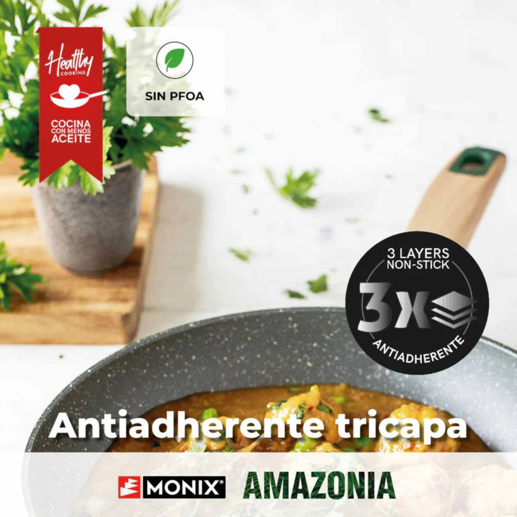 La cacerola baja Amazonia es una olla tipo rustidera de paredes bajas y antiadherente de alta calidad (¡integra un antiadherente tricapa de lo más duradero!), que te dará mucho juego en la cocina.