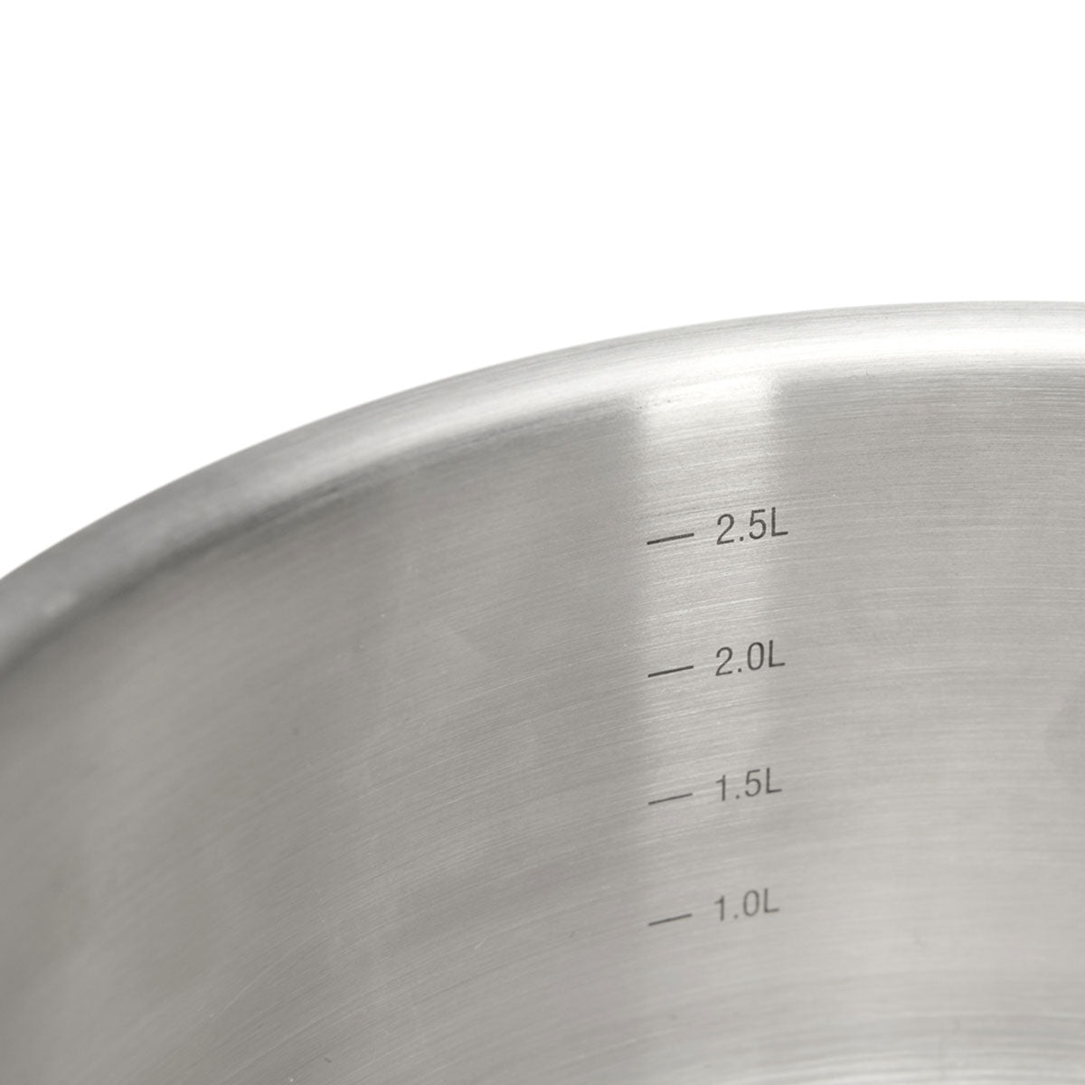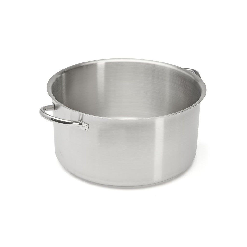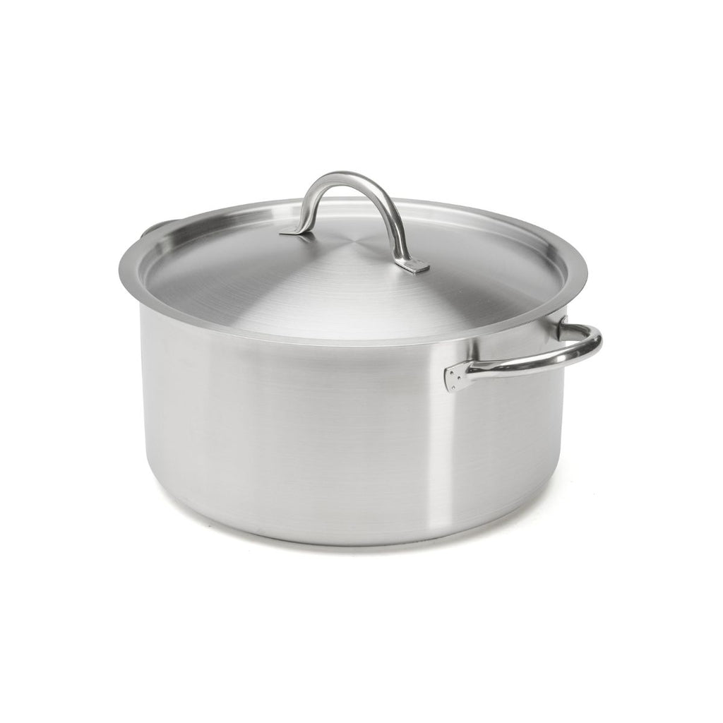Olla baja de acero inoxidable 18/10 con acabado satinado y base difusora del calor, apta para todas las cocinas, incluida la inducción.