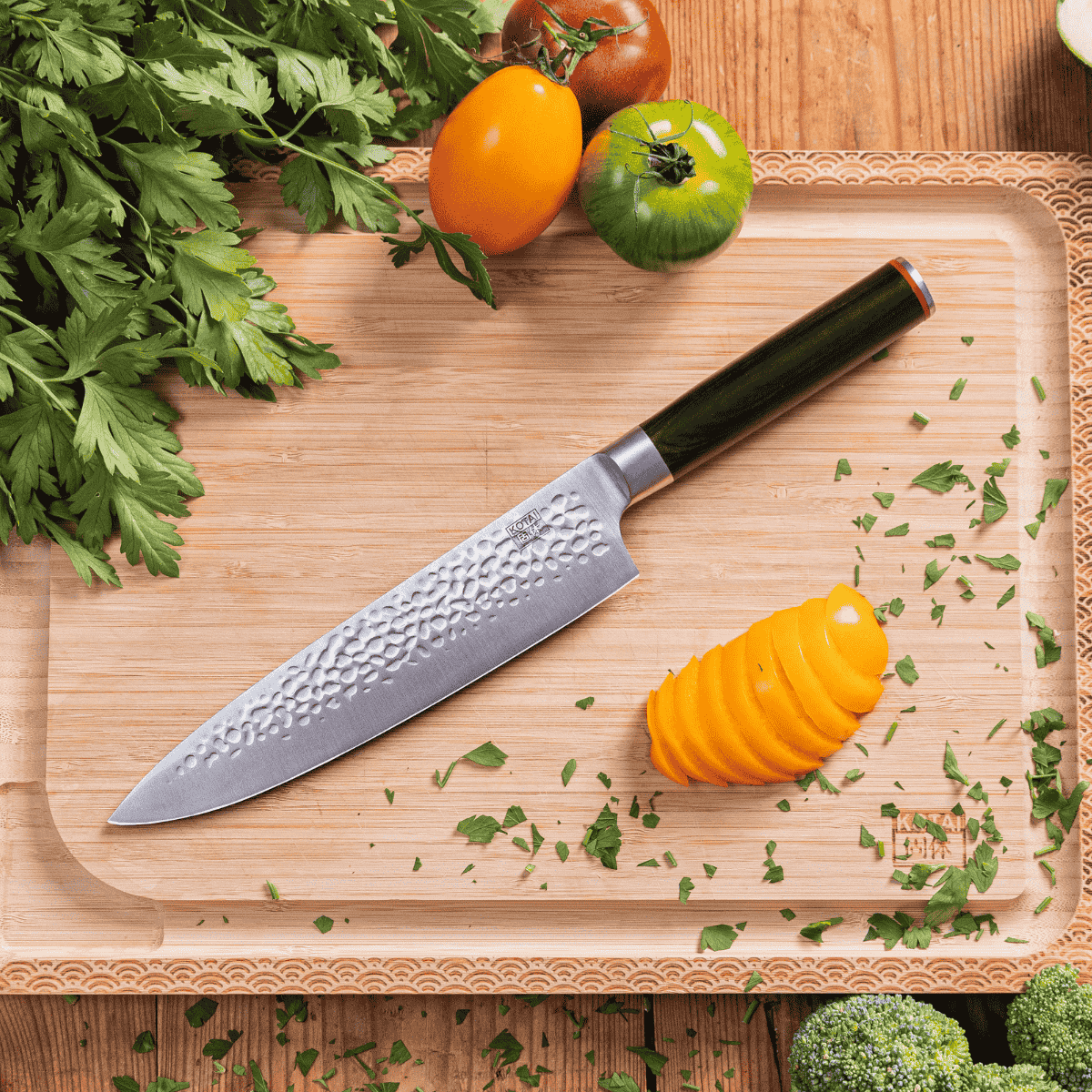 • Equilibrio en la geometría de la hoja. Las hojas de los cuchillos Kotai son un híbrido entre las hojas alemanas y las japonesas, permitiendo un corte preciso y un movimiento oscilante para picar con facilidad.