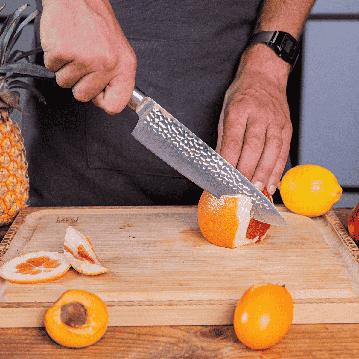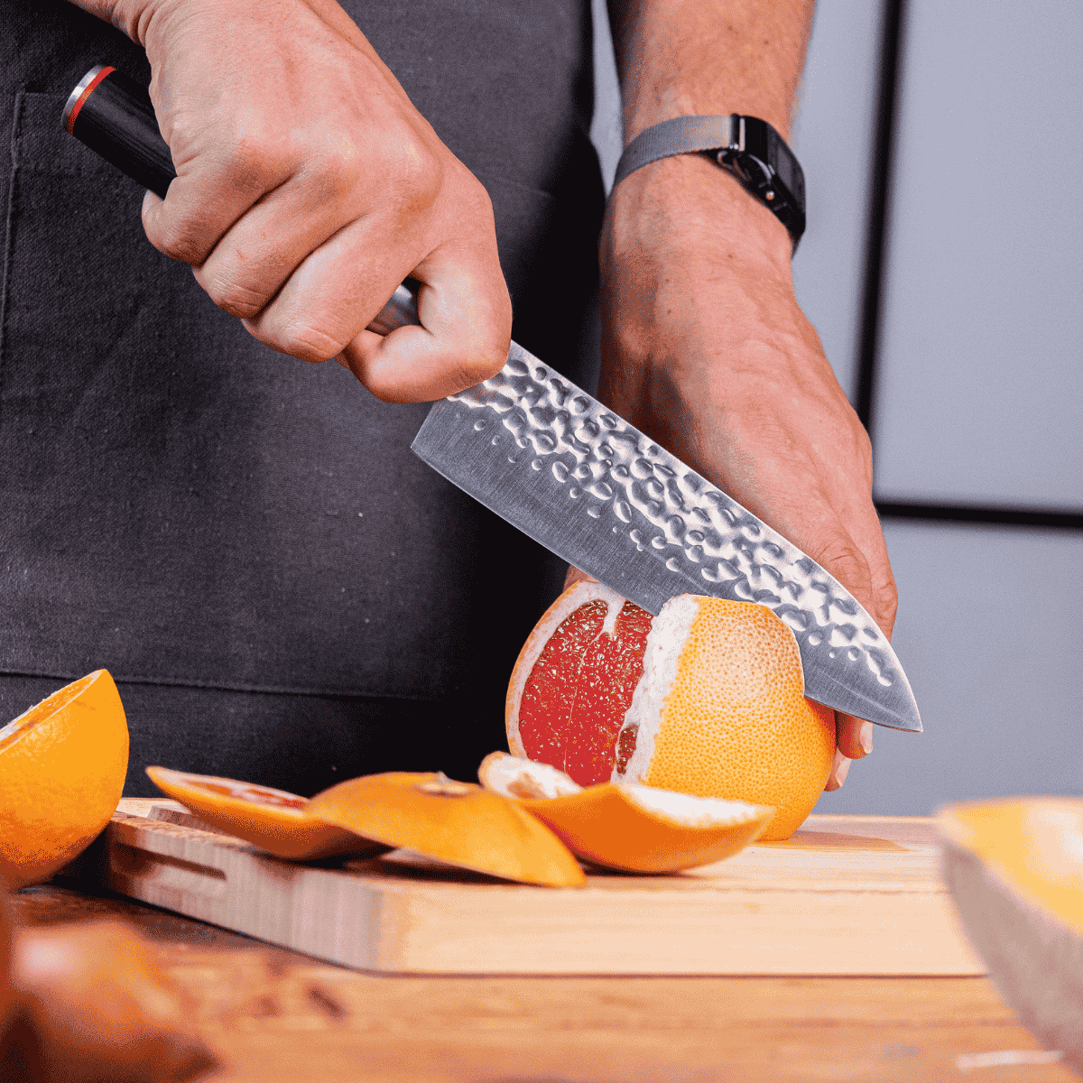 • Chef Gyuto. Cómodo, afilado y multiusos. El Gyuto es el equivalente japonés del cuchillo de chef, ágil y bien equilibrado para un agarre cómodo, es capaz de cortar cualquier cosa excepto huesos y alimentos congelados.