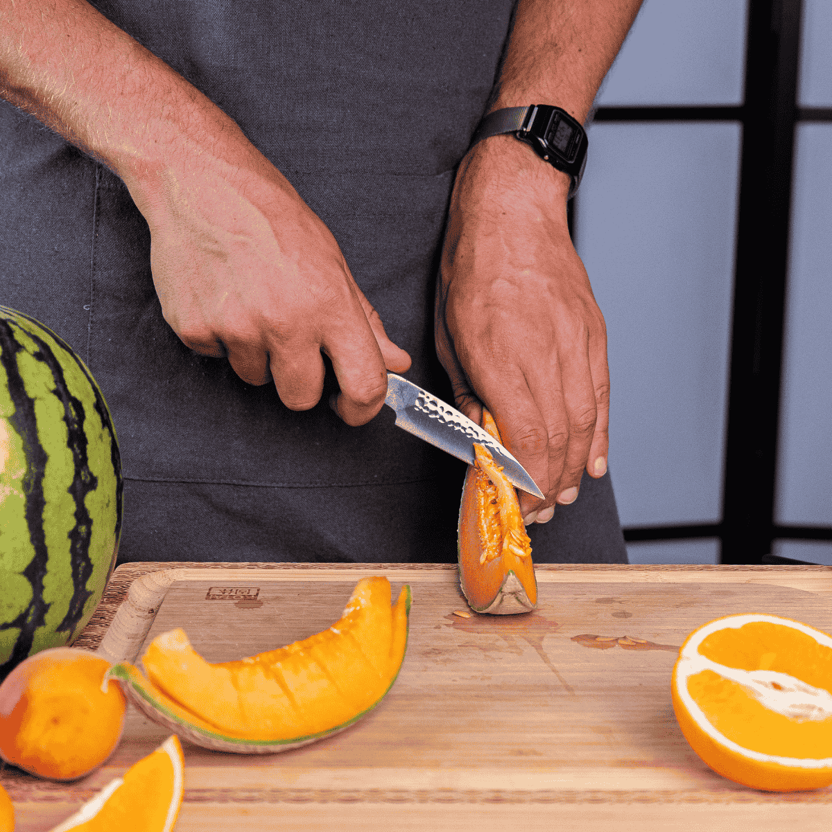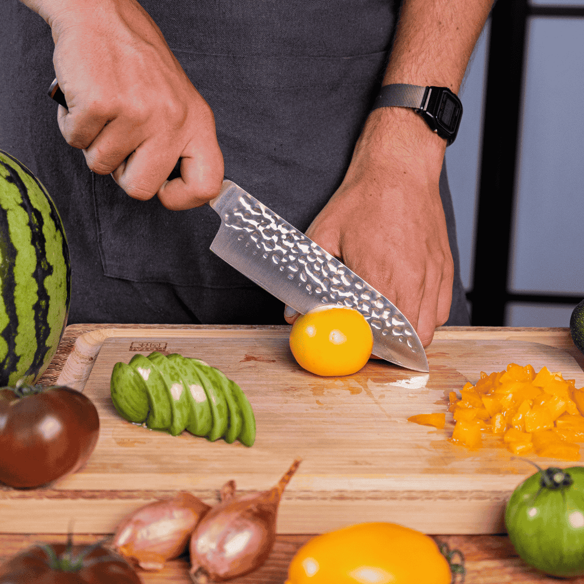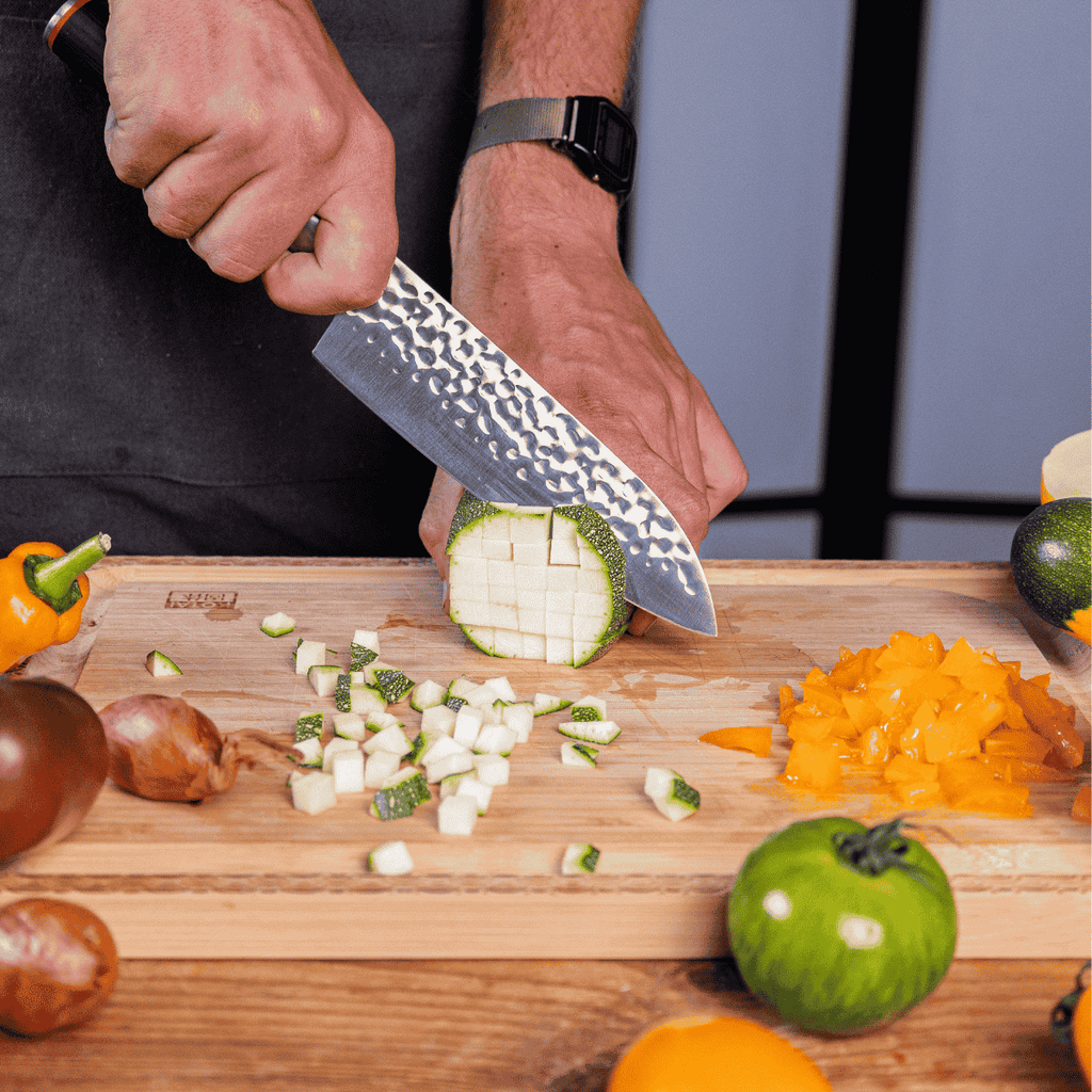 • Santoku. Cómodo, fácil de manejar, afilado y multiusos. El nombre Santoku significa “tres virtudes” en japonés. Su hoja versátil es ideal para picar verduras y frutas, rebanar carnes y preparar pescado.