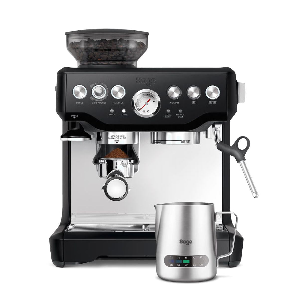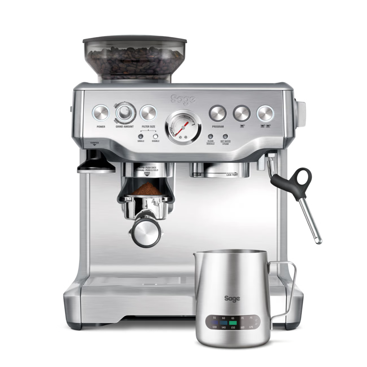 ¿Tienes 1 minuto? Con la Cafetera manual Barista Express de Sage es el tiempo que necesitas. Del grano a la taza, esta máquina compacta muele la cantidad precisa de tu variedad favorita, conservando todo su aroma y dando como resultado un espresso de gran sabor, que rozará la perfección con la leche microespumada del vaporizador.