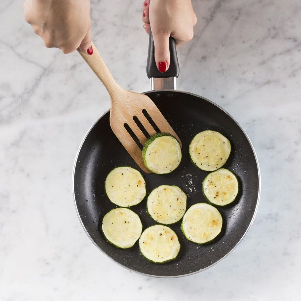 La Espátula Ranurada con Sujeción de Rejillas es ideal para voltear carnes y verduras en sartenes o bandejas de horno. Las ranuras permiten que los líquidos y aceites fluyan libremente al remover o levantar los alimentos. El mango está especialmente diseñado para extraer y empujar las rejillas del horno al revisar el horneado.