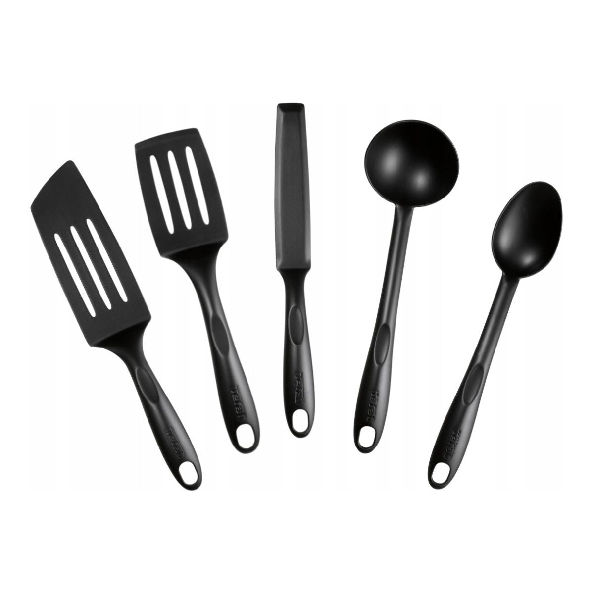 Este set de 5 utensilios Ingenio Tefal es perfecto para cualquier cocina ya que incluye aquellas piezas que más se utilizan en la preparación de desayunos, cenas y comidas. El set está formado por 2 espátulas diferentes, 1 cucharón, 1 cuchara y una espumadera fabricados con materiales de primera calidad y reforzados con fibra de vidrio para que sean más duraderos.