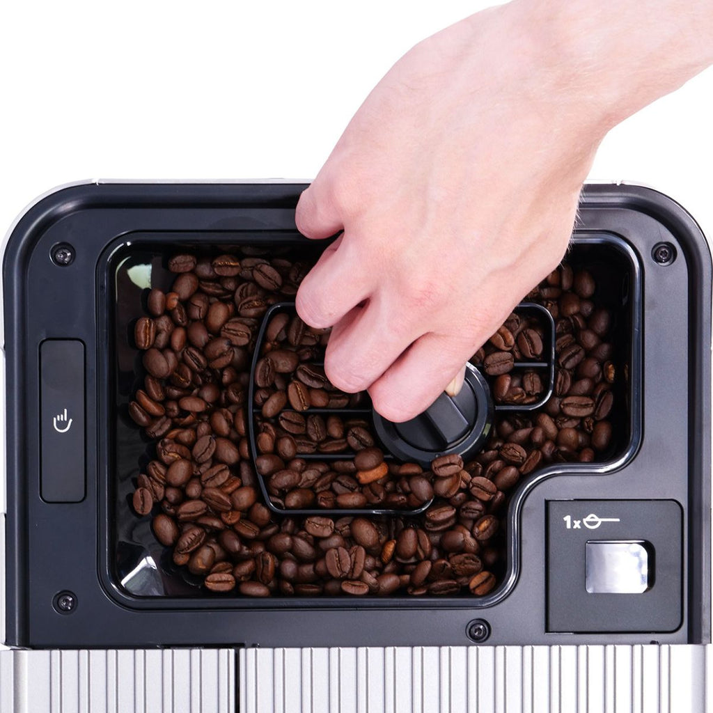 Tolva extraíble para el café en grano, con capacidad para 270 g de café. ¿Te apetece probar una nueva variedad de café? ¿Quieres experimentar con el tipo de tueste? Solo tienes que girar y levantar la tolva para retirarla, vaciarla y volver a llenarla con granos de café. Con la tolva llena podrás preparar hasta 22 tazas de espresso.