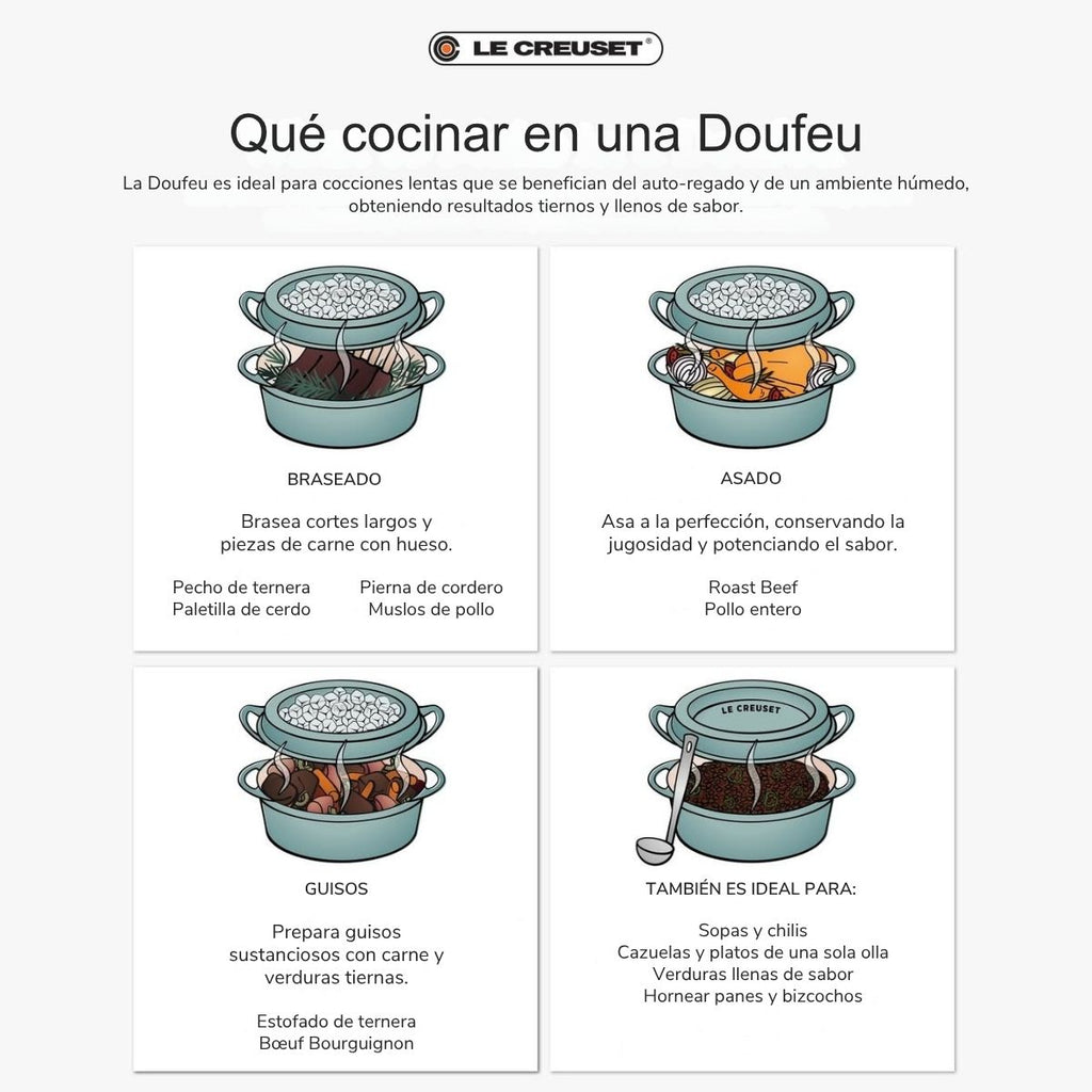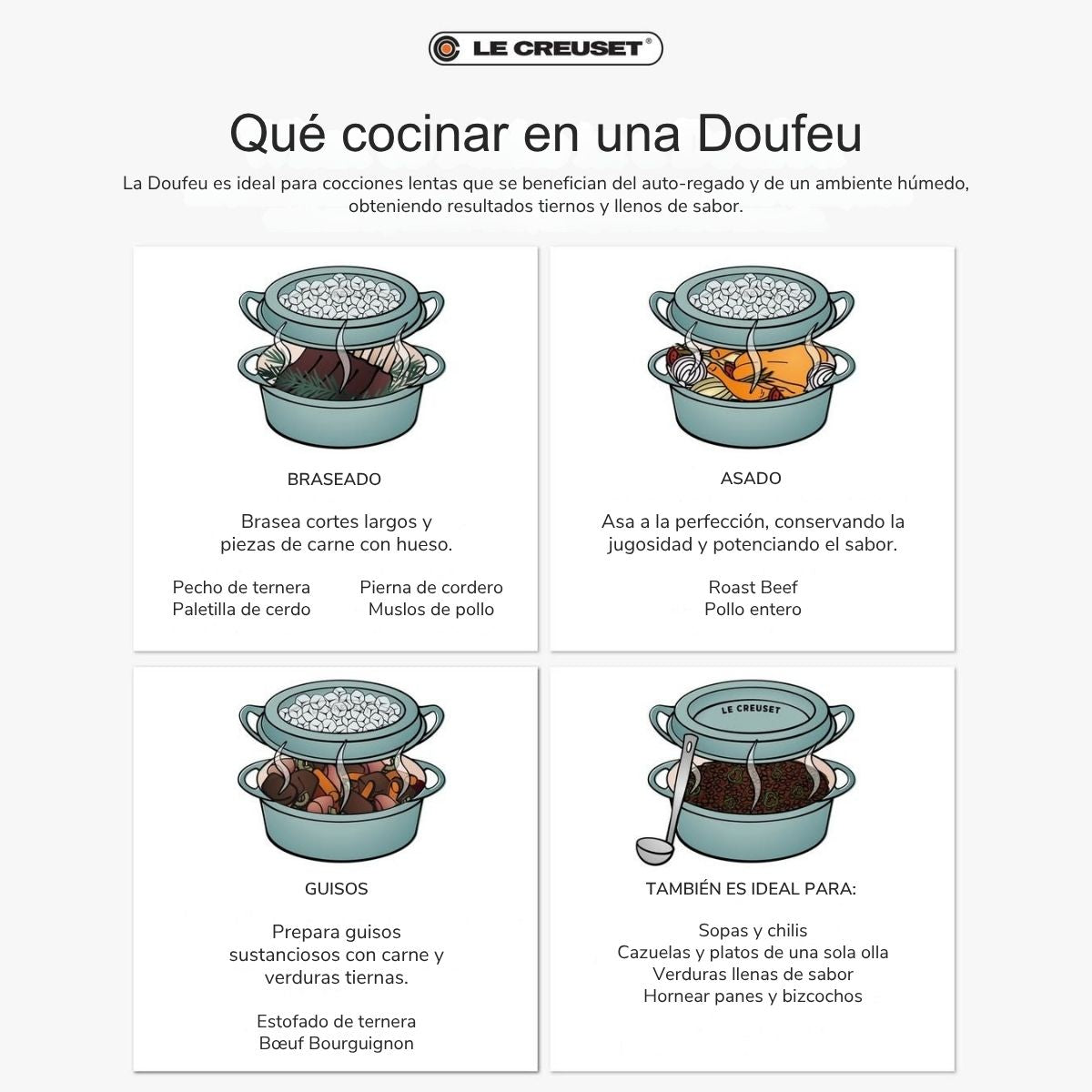 La cocotte Doufeu oval de hierro de Le Creuset es una pieza clásica de la marca francesa. Su diseño, casi centenario, es ideal para guisos que requieran una cocción lenta y prolongada, como los que hacía tu abuela y que tan sabrosos resultaban. Perfecta para cocinar a fuego suave, o en francés, "doufeu", como esta preciosa cocotte.