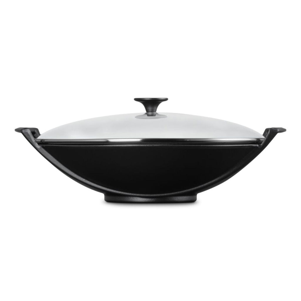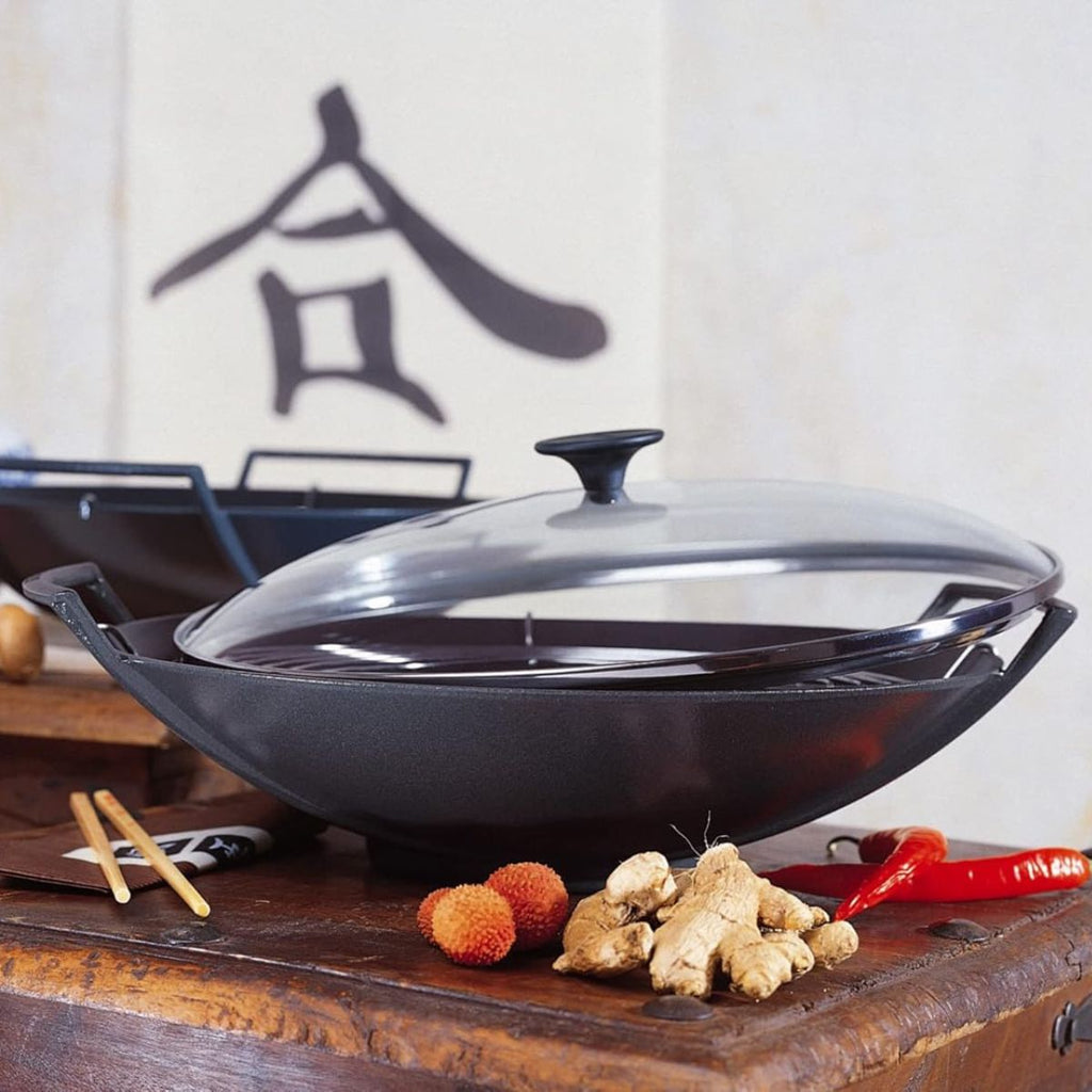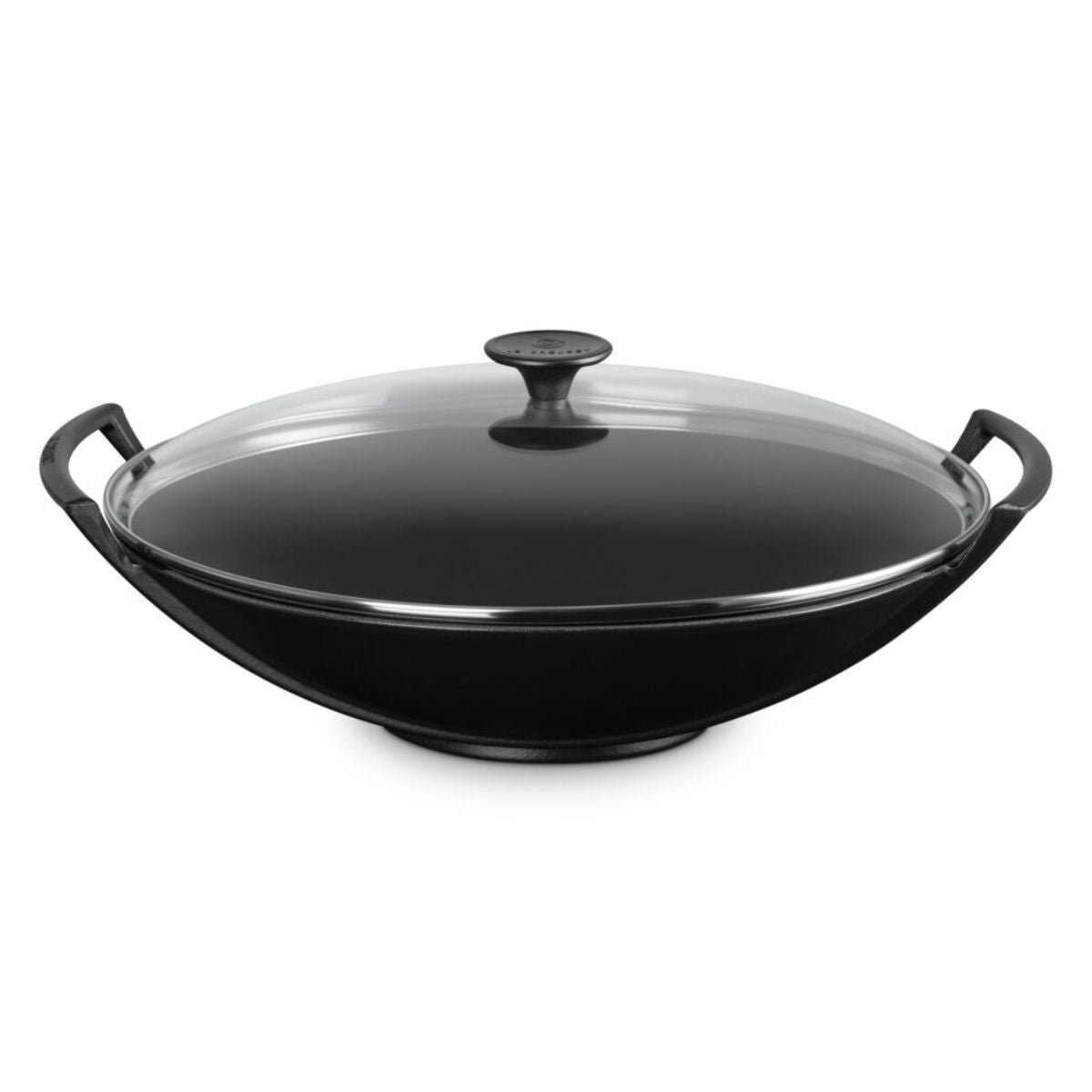 El Wok (kuo en el idioma mandarín) que significa literalmente "recipiente en el que se cuece", es un utensilio originario de la China. El Wok de Le Creuuset se une a la colección de menaje de cocina de hierro colado. El pomo fenólico de la tapa de cristal, luce en perfecta harmonía con el esmaltado negro mate.