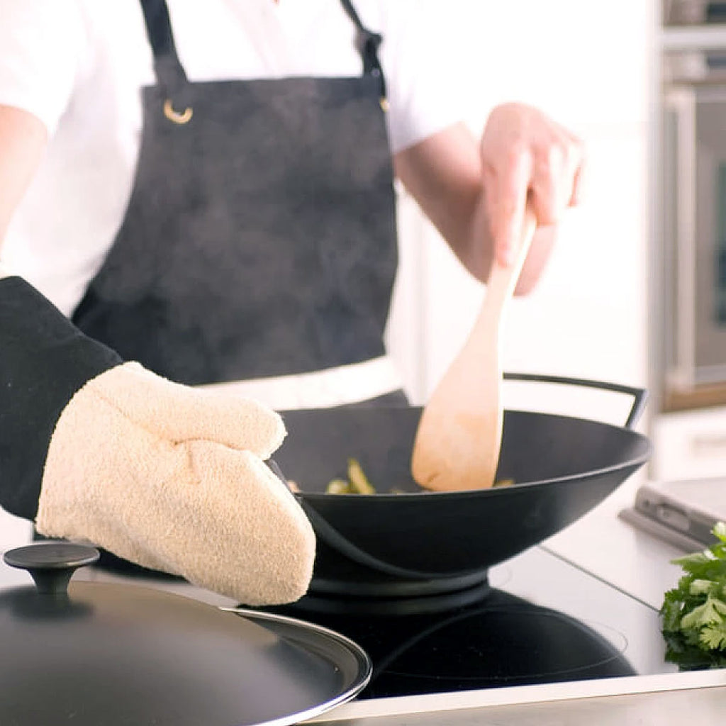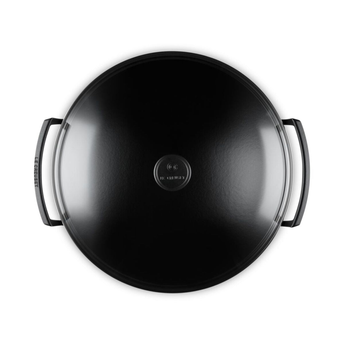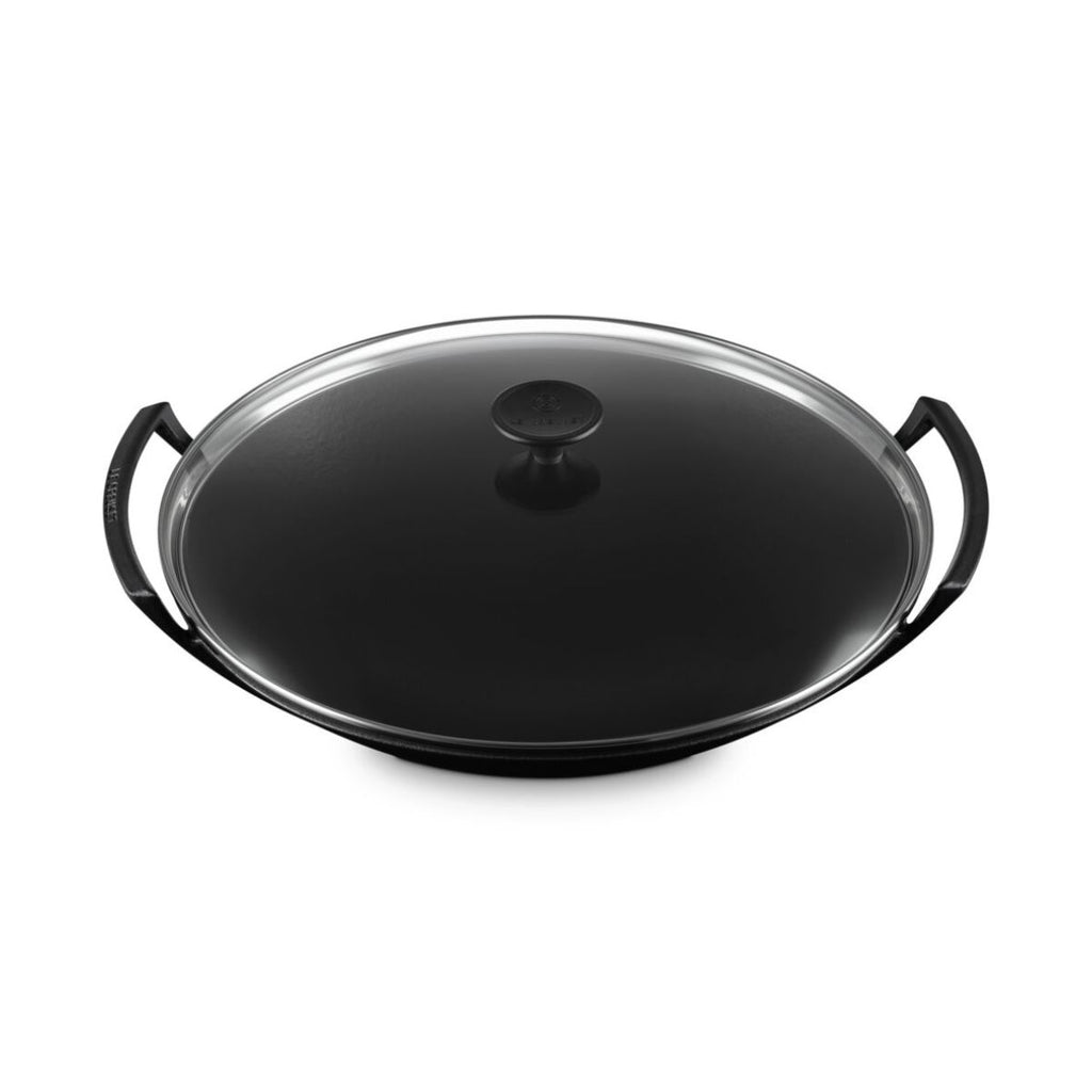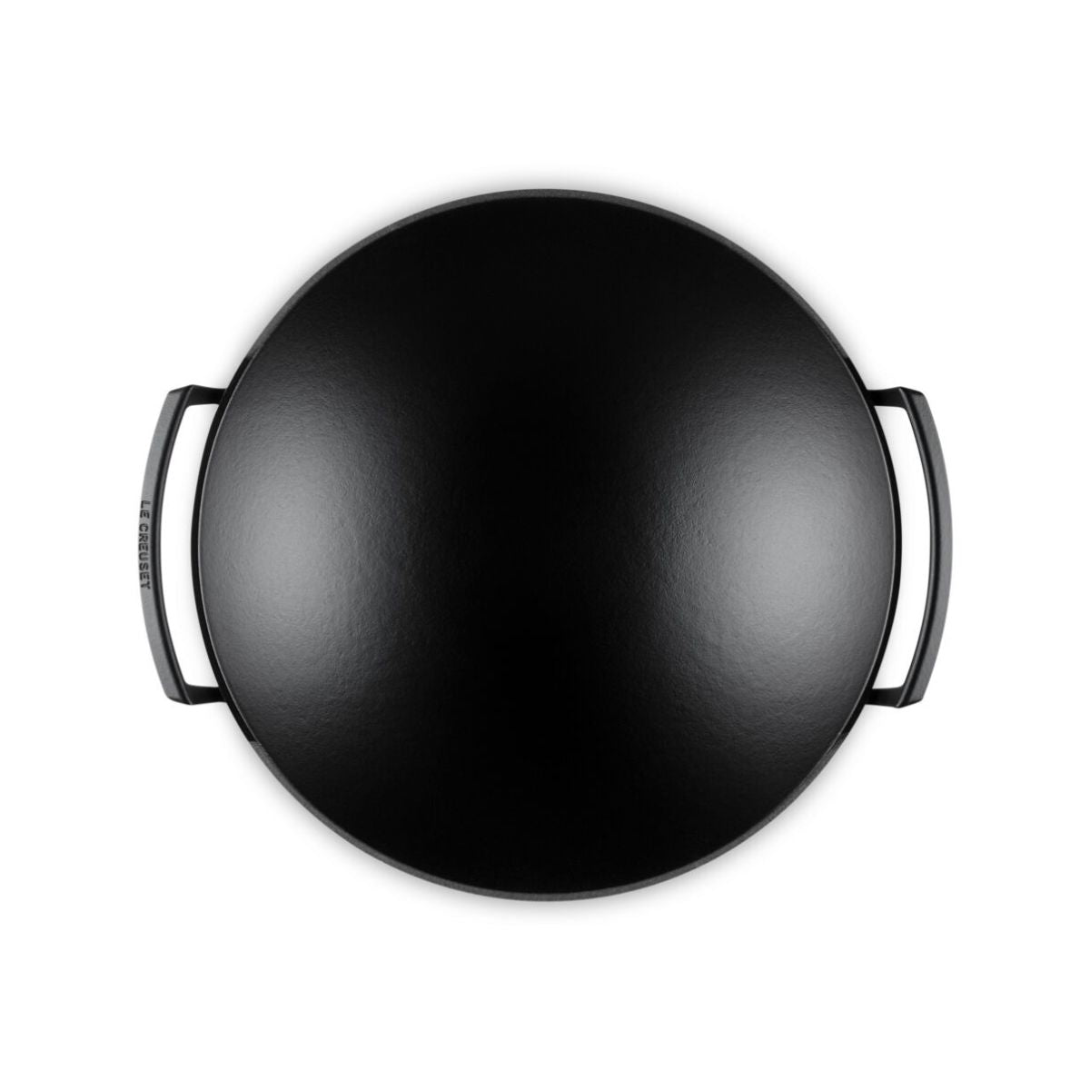 El Wok (kuo en el idioma mandarín) que significa literalmente "recipiente en el que se cuece", es un utensilio originario de la China. El Wok de Le Creuuset se une a la colección de menaje de cocina de hierro colado. El pomo fenólico de la tapa de cristal, luce en perfecta harmonía con el esmaltado negro mate.