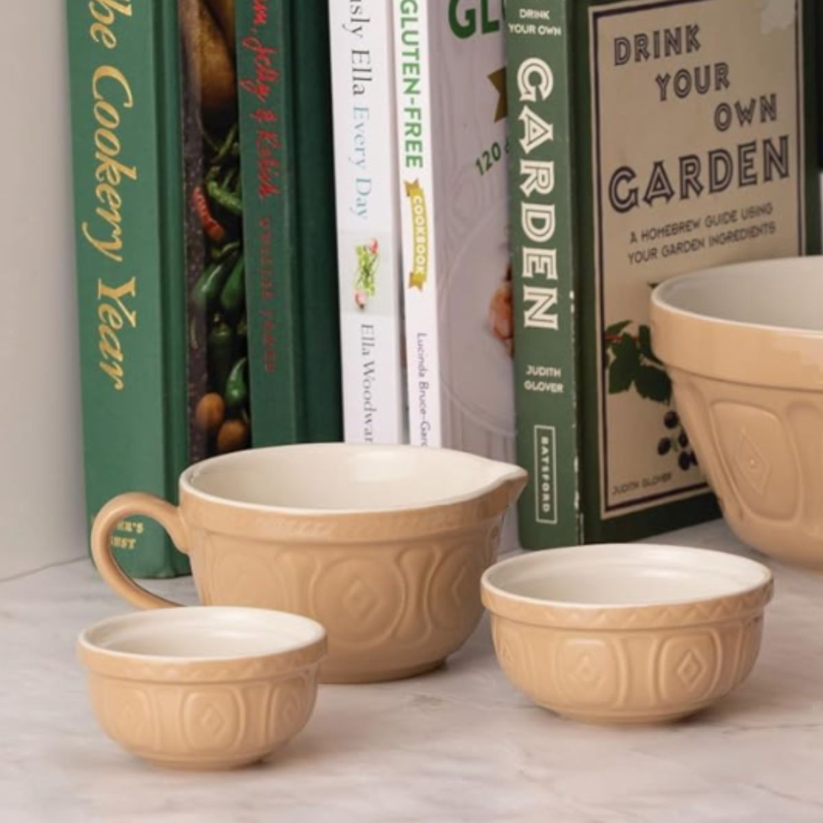 • Set de 3 boles medidores cerámicos con asa Mason Cash (para medir tus recetas en cantidades de 1 taza, media taza y un cuarto de taza).