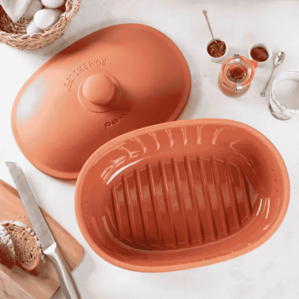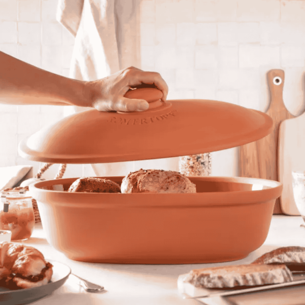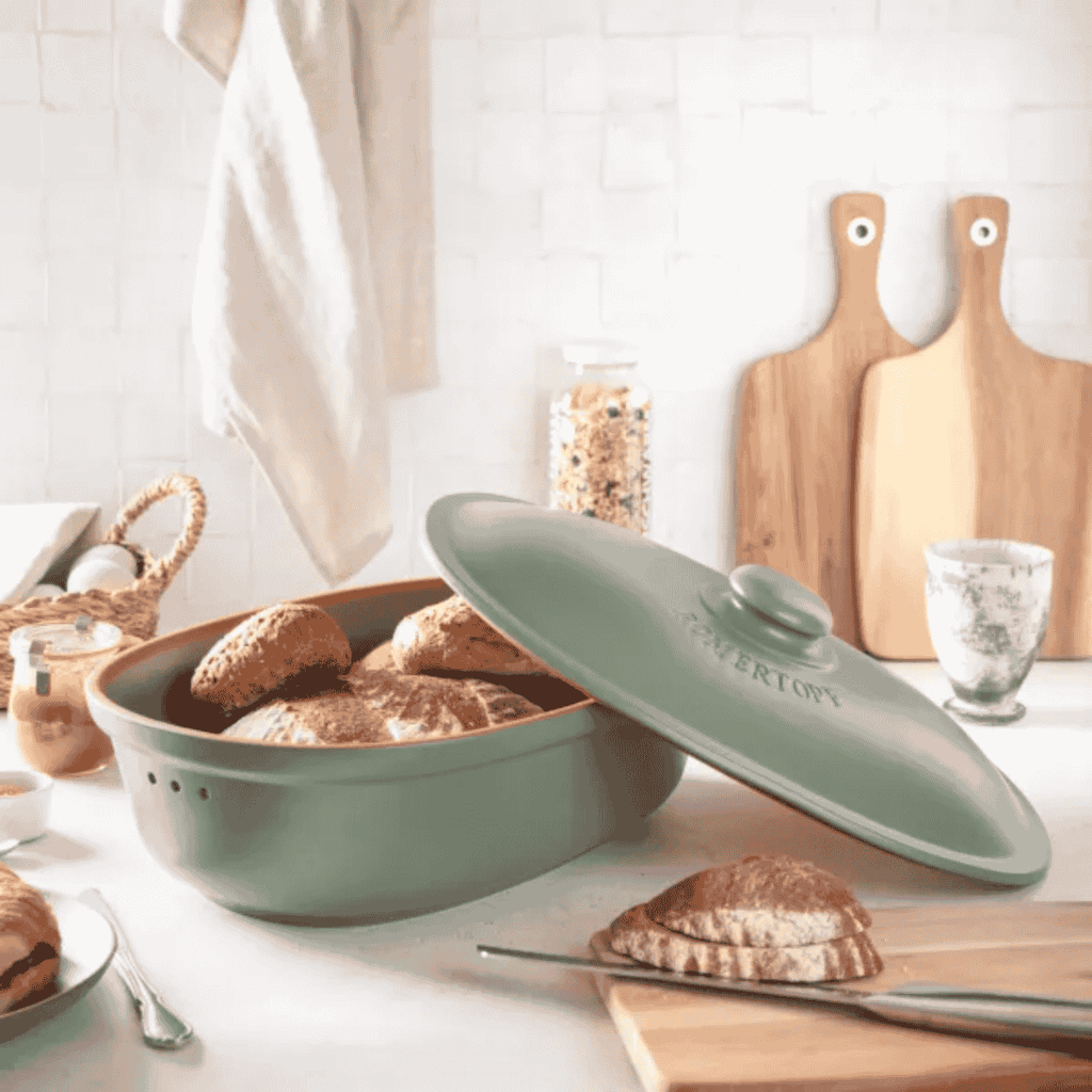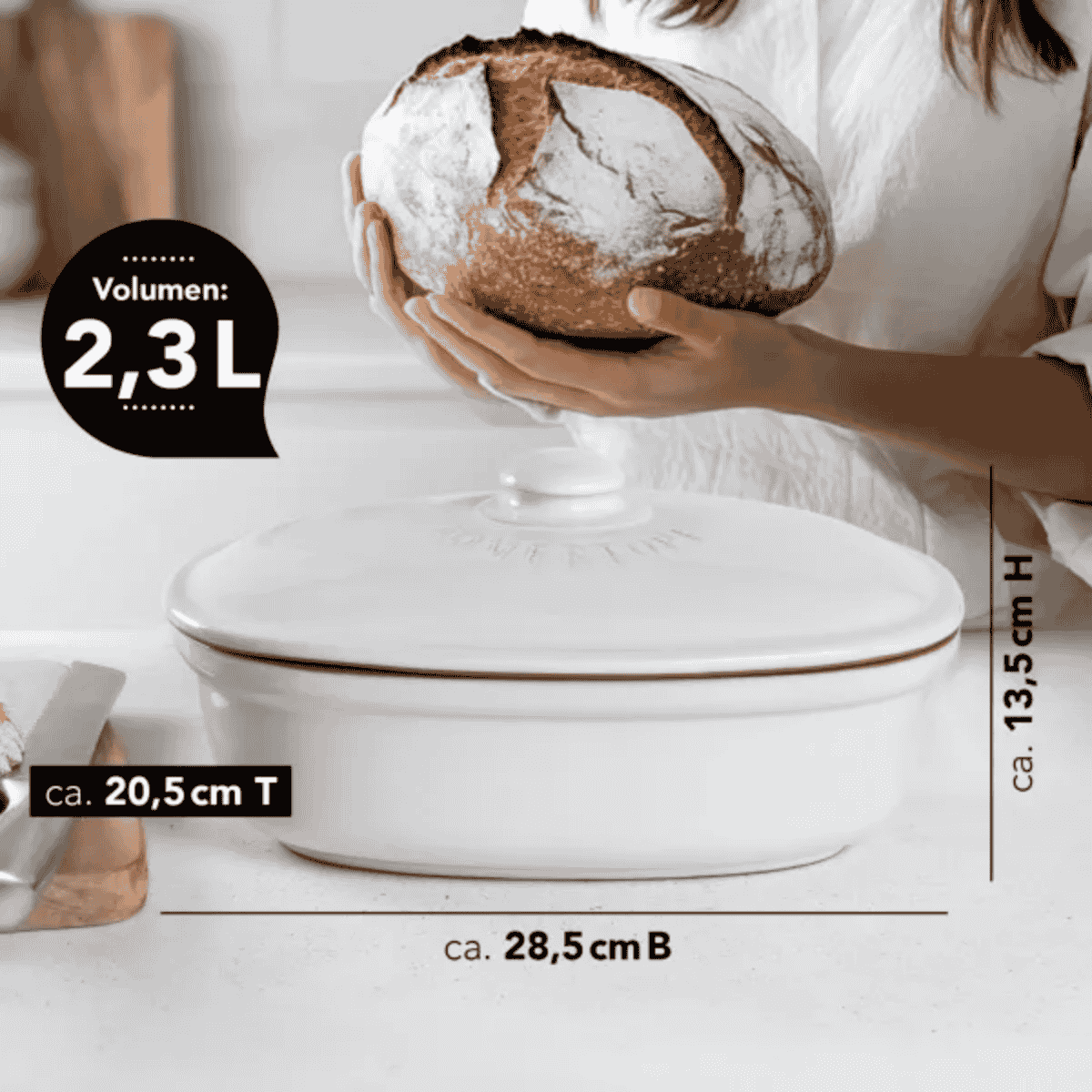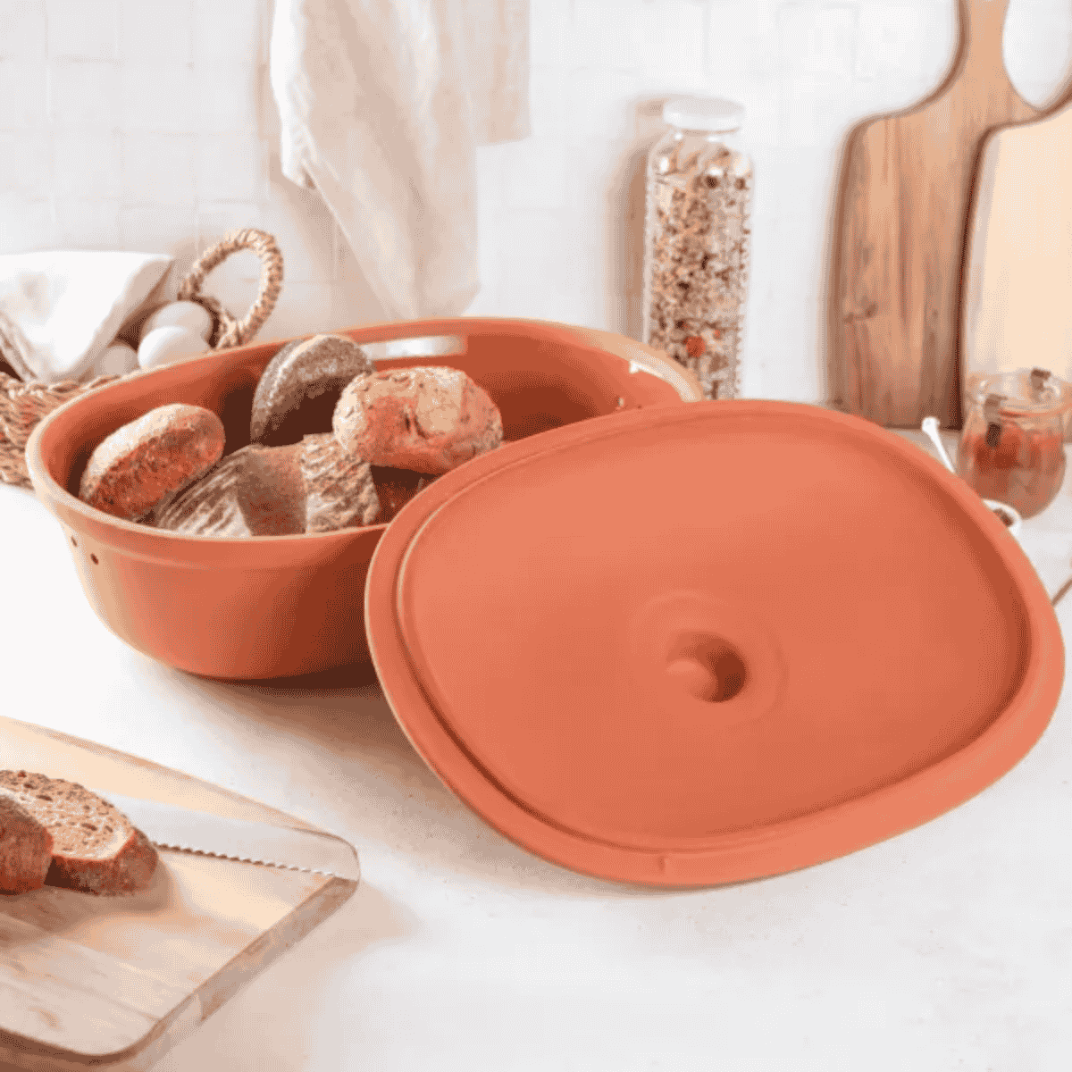 Fabricada con arcilla de alta calidad, la Panera ovalada de terracota Römertopf te ayudará a conservar el pan y la bollería frescos y en óptimas condiciones durante más tiempo. Robusta, elegante y muy resistente, esta panera con tapa se va a convertir en una aliada imprescindible en tu cocina gracias a su funcionalidad, su bonito diseño atemporal y a todas sus ventajas. Además, es perfecta como recipiente de conservación para hortalizas y frutas, desde cebollas, ajos o patatas, a naranjas, limones o mandarinas.