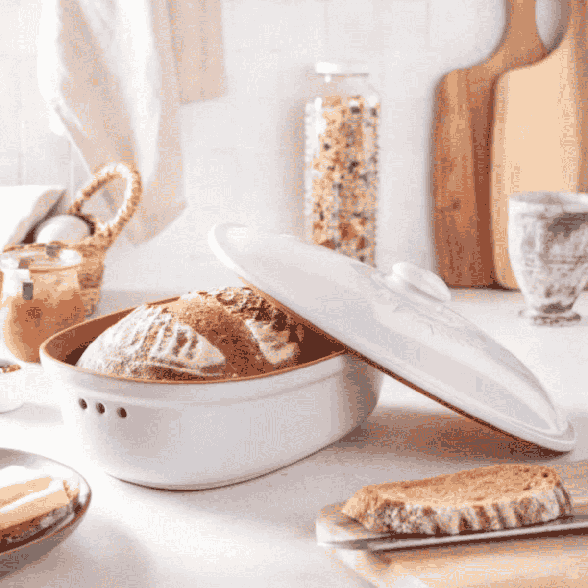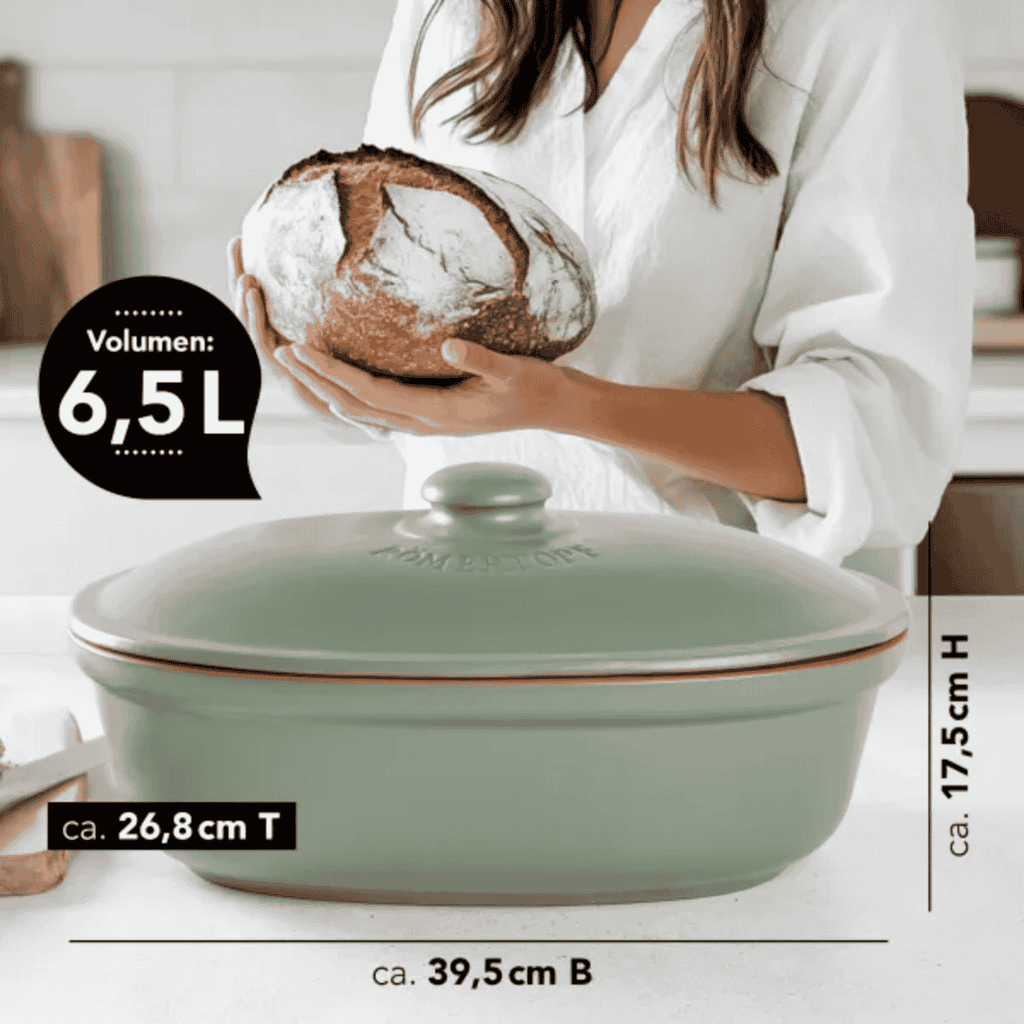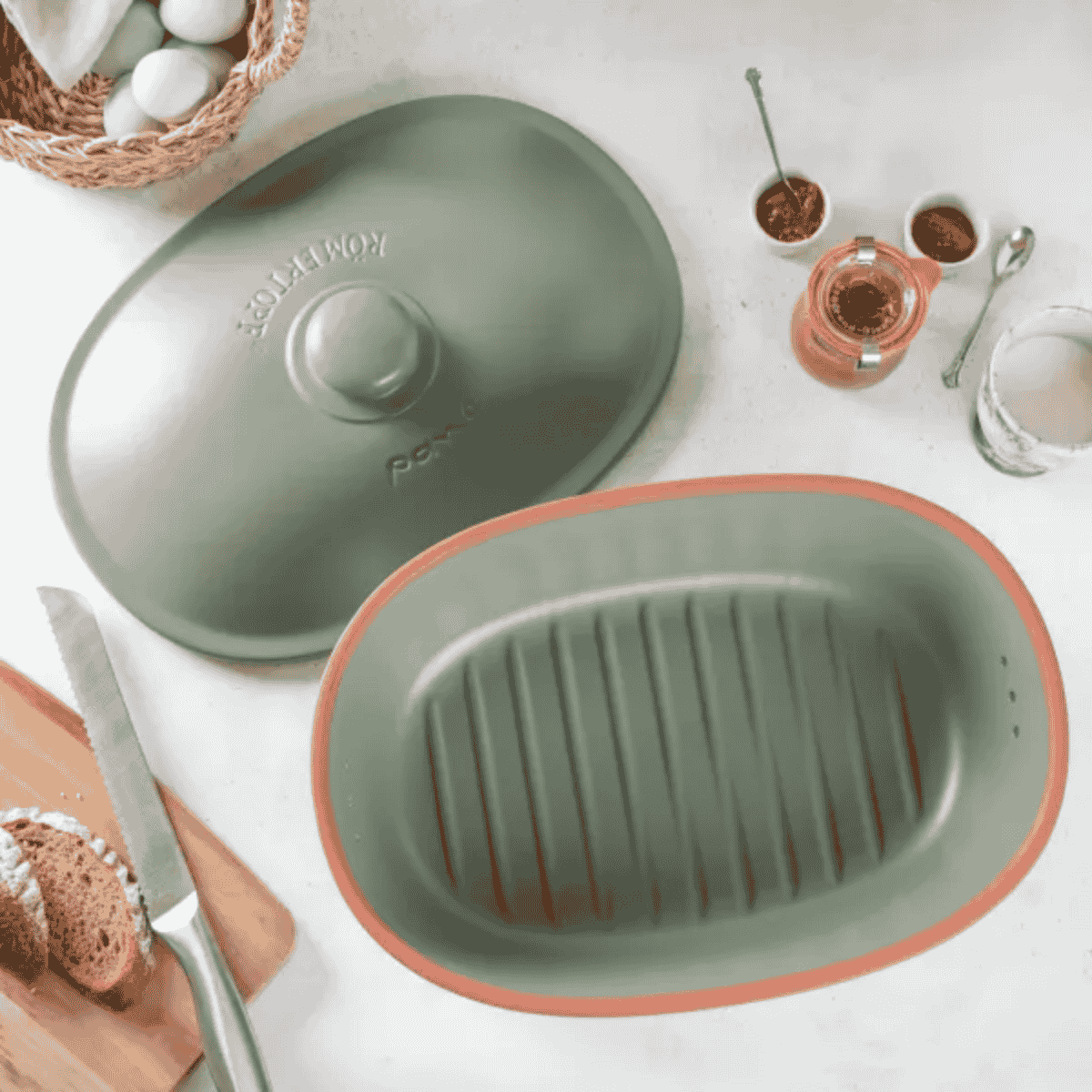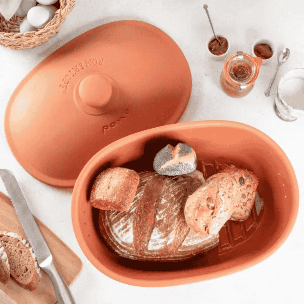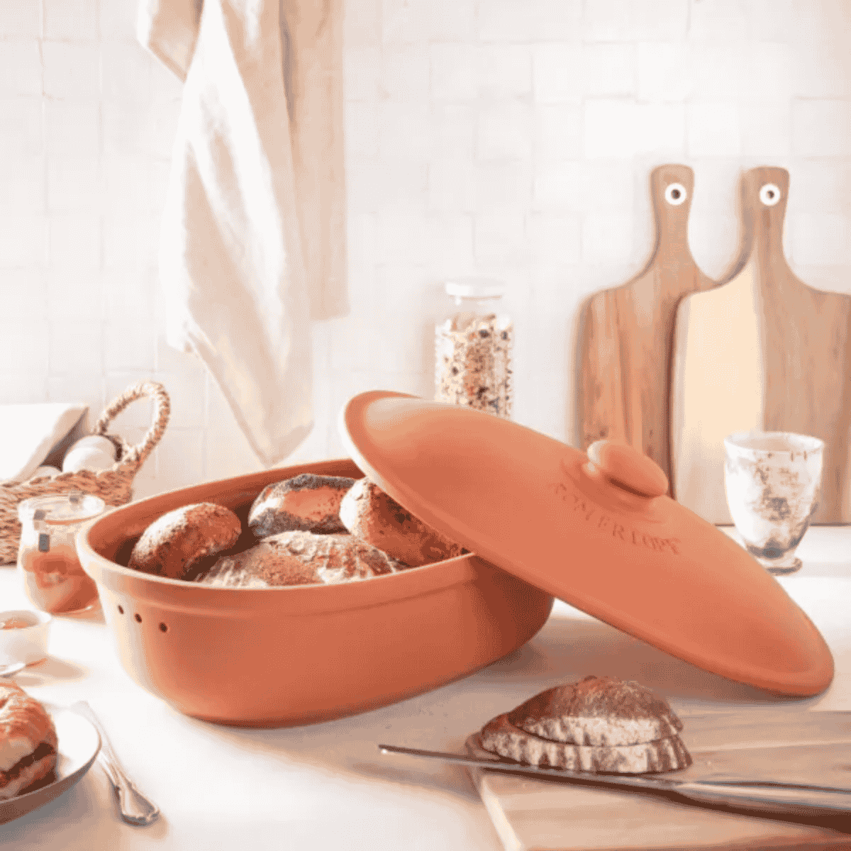 Fabricada con arcilla de alta calidad, la Panera ovalada de terracota Römertopf te ayudará a conservar el pan y la bollería frescos y en óptimas condiciones durante más tiempo. Robusta, elegante y muy resistente, esta panera con tapa se va a convertir en una aliada imprescindible en tu cocina gracias a su funcionalidad, su bonito diseño atemporal y a todas sus ventajas. Además, es perfecta como recipiente de conservación para hortalizas y frutas, desde cebollas, ajos o patatas, a naranjas, limones o mandarinas.