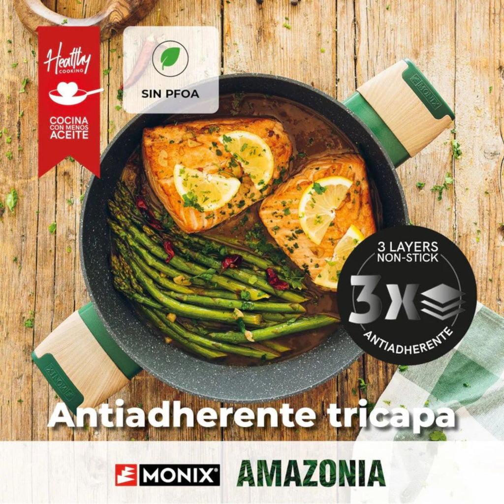 Con la Batería de cocina 4 piezas Amazonia Monix, además de equipar tu cocina con un set de menaje antiadherente de excelente calidad, cocinarás de forma más rápida y eficiente, al tiempo que cuidas del medioambiente. La colección Amazonia de Monix ha sido creada con un diseño diferente y original, para disfrutar de la cocina y transmitir un mensaje de ecología, naturaleza y sostenibilidad.