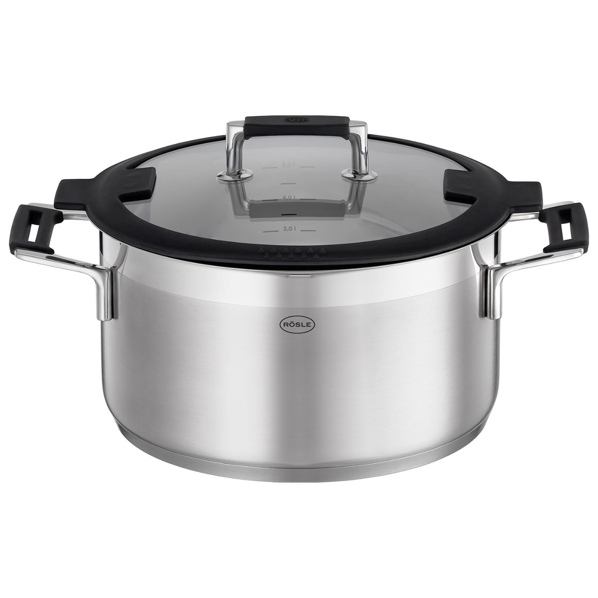 La batería de cocina Silence Pro Rösle de 5 piezas, además de las 3 ollas altas y el cazo, incluye una cacerola baja o rustidera, teniendo así todas las piezas que puedes requerir en la cocina: