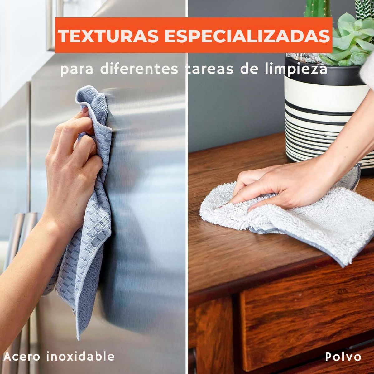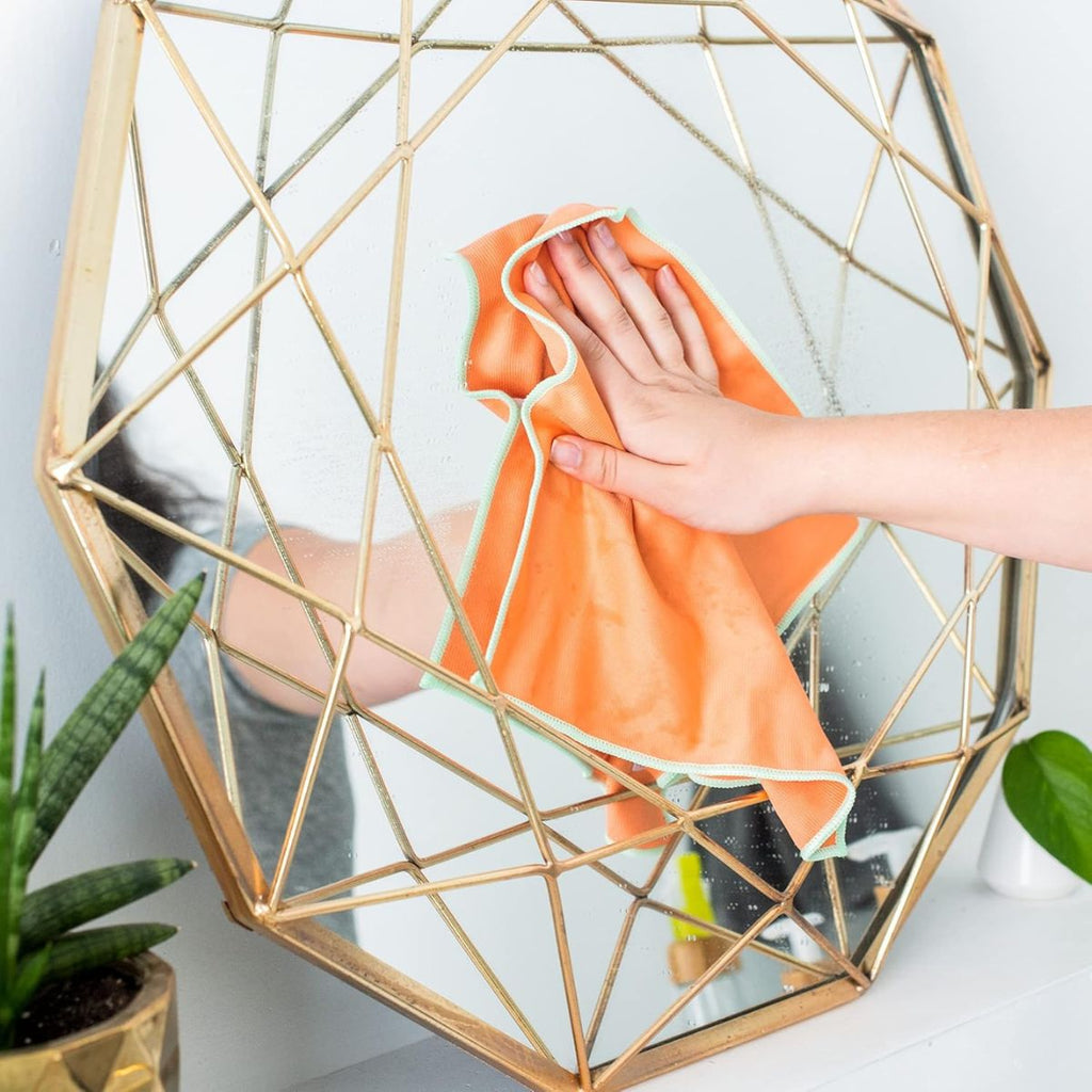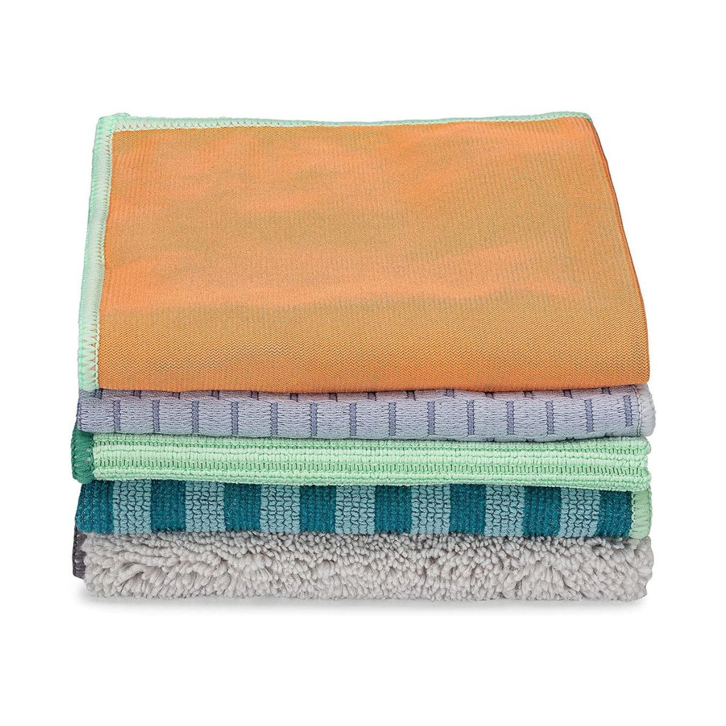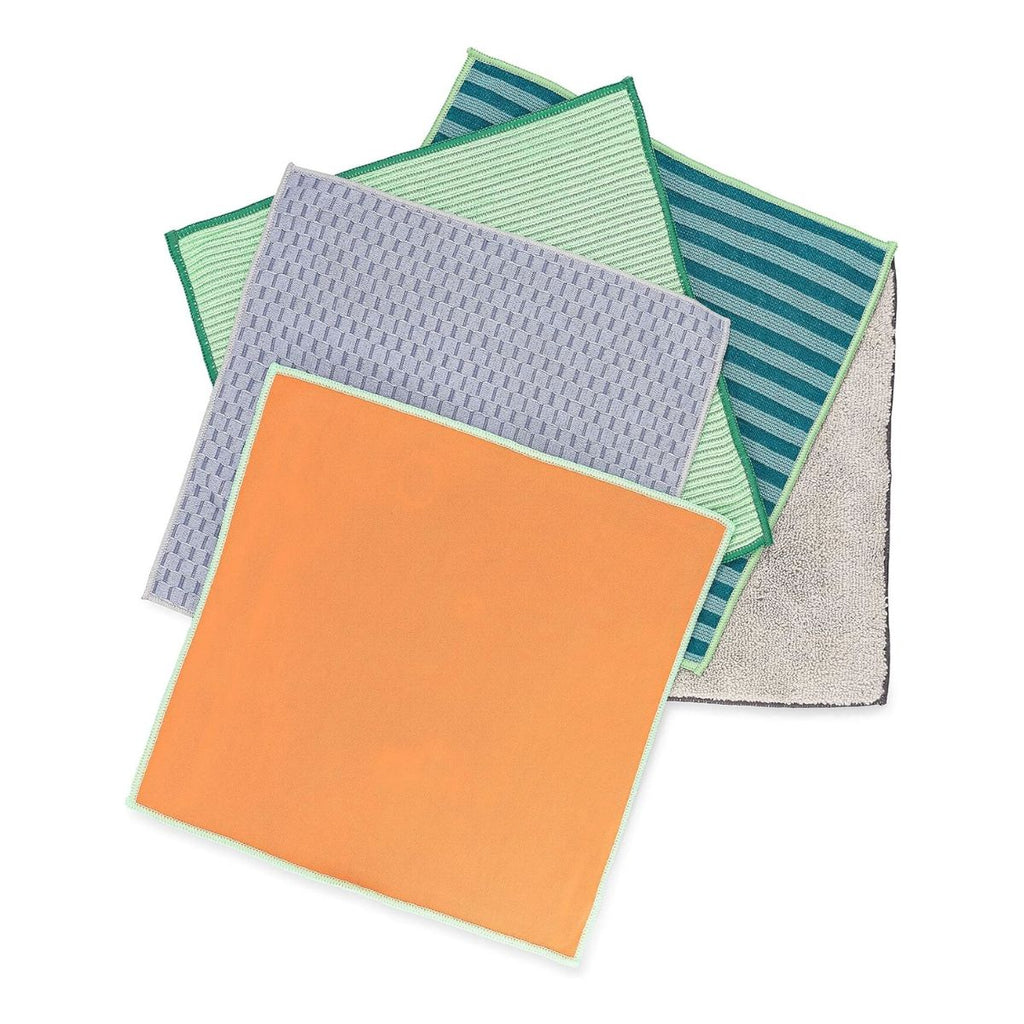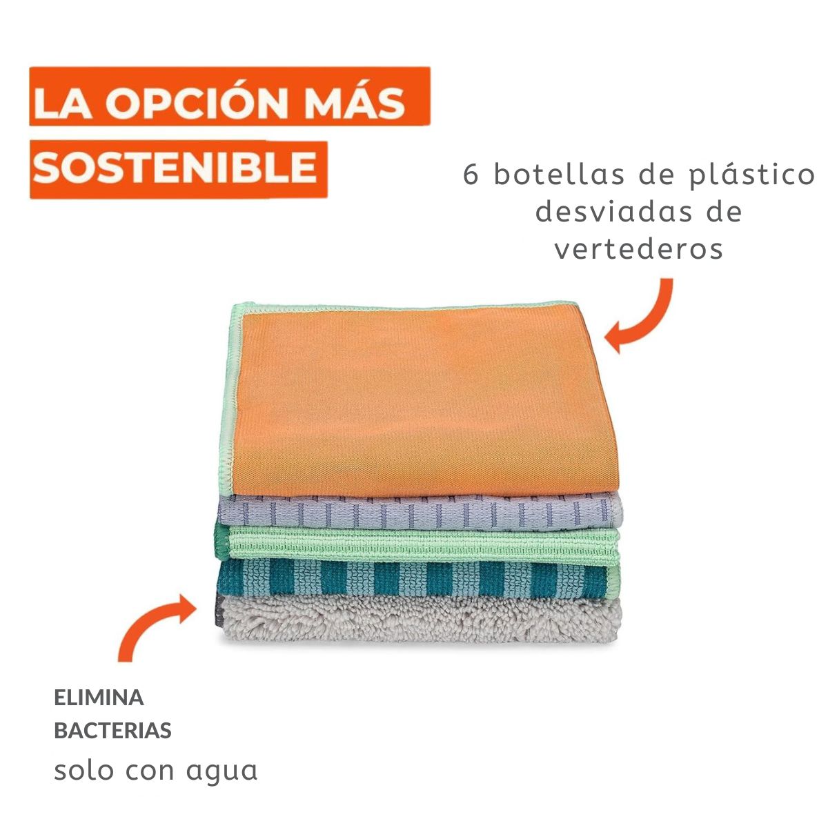El set de 5 paños de microfibra Renew de Full Circle incluye un paño para cada tipo de superficie. El primero está fabricado específicamente para la limpieza del baño y los azulejos (etiquetado con BATH AND TILES), el segundo para limpiar y atrapar el polvo (DUST), el tercero para el vidrio (etiquetado con GLASS), el cuarto para la grasa que se acumula en la cocina, hornos o estufas (GREASE) y el quinto para piezas de acero inoxidable (STAINLESS STEEL). ¡Si es que no puede ser más completo!