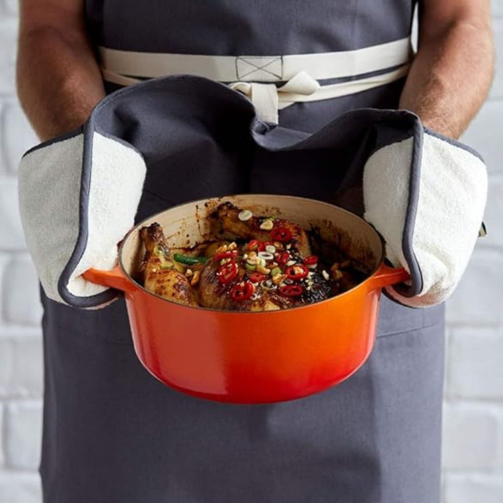 En una única pieza, el elegante Guante de cocina doble Flint Le Creuset protegerá tus dos manos mientras sujetas con seguridad tus cazuelas, cocottes, bandejas, sartenes o rustideras. El guante doble está confeccionado en algodón 100% y es muy resistente, para que no tengas de lo que preocuparte al manipular los utensilios calientes en la cocina, o para llevarlos del horno a la mesa.