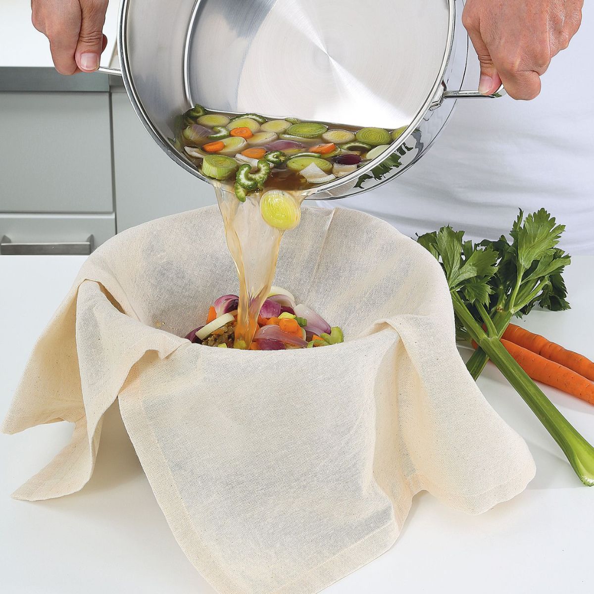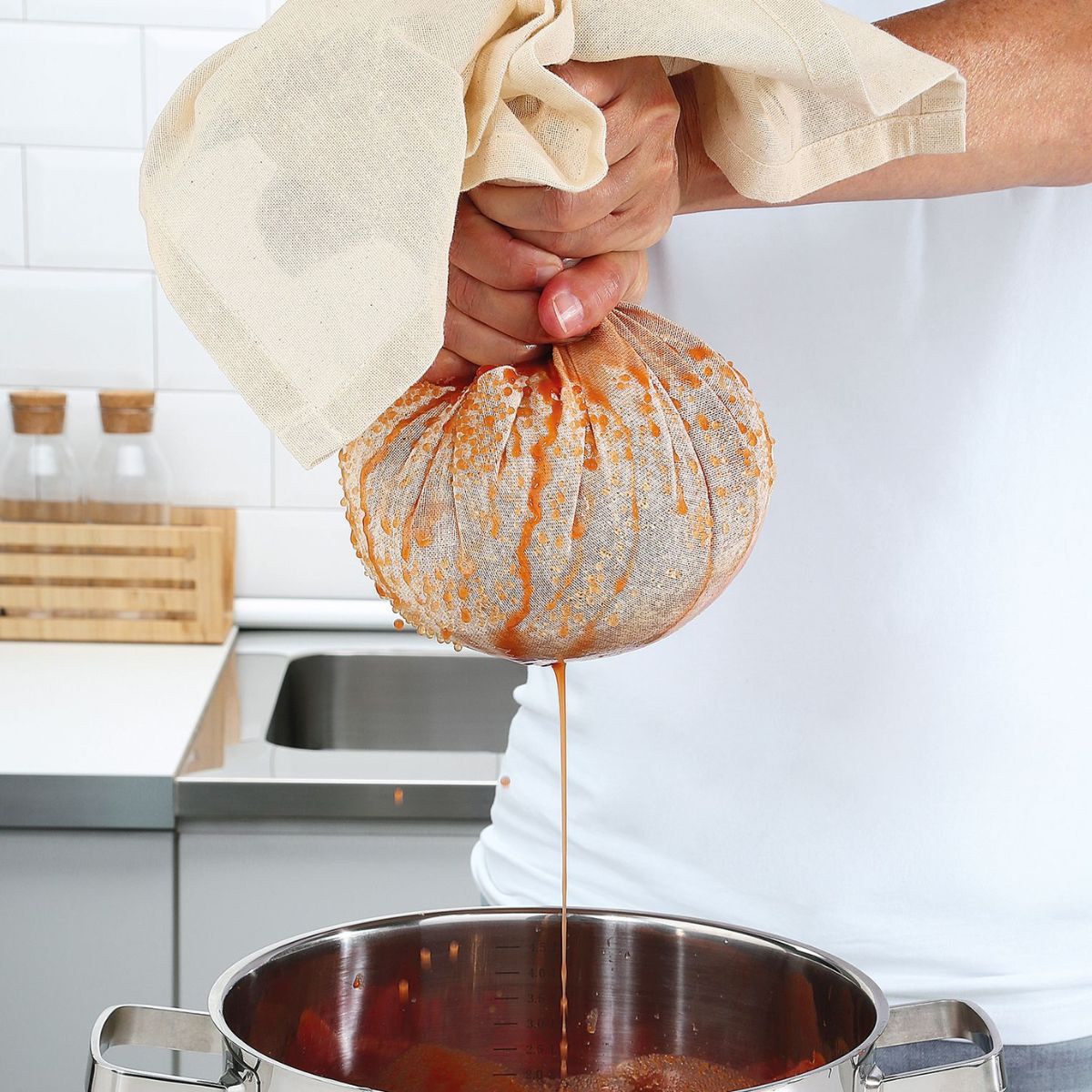 La Malla de algodón para exprimir y prensar Küchenprof es amplia. Mide 80 cm de largo x 65 cm de ancho, y es perfecta para su uso en muchas elaboraciones habituales en la cocina. Es muy práctica y tiene la virtud de que se lava muy fácilmente, tanto a mano como en la lavadora, a un máximo de 60º C. Seguro que la usarás mucho, como por ejemplo para: