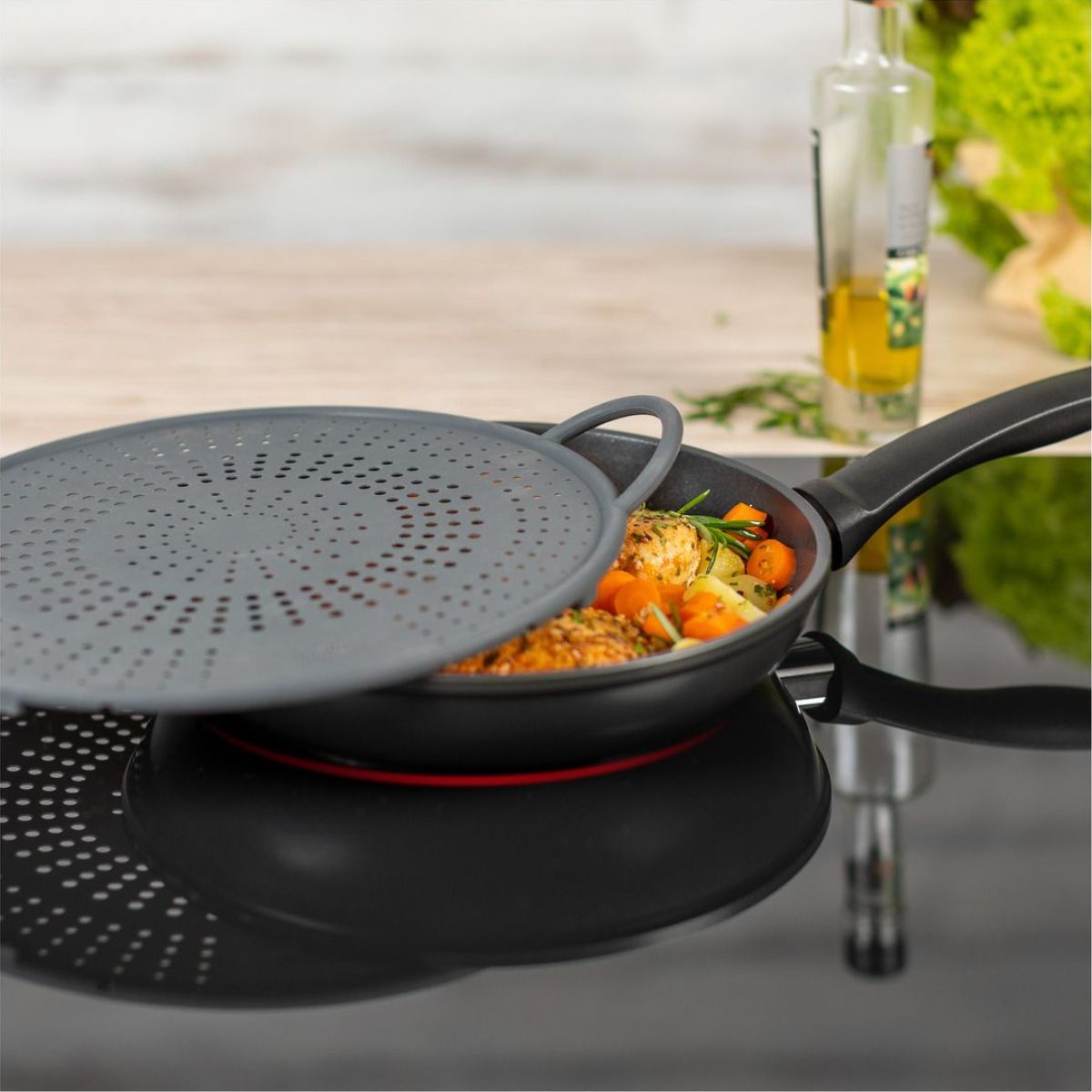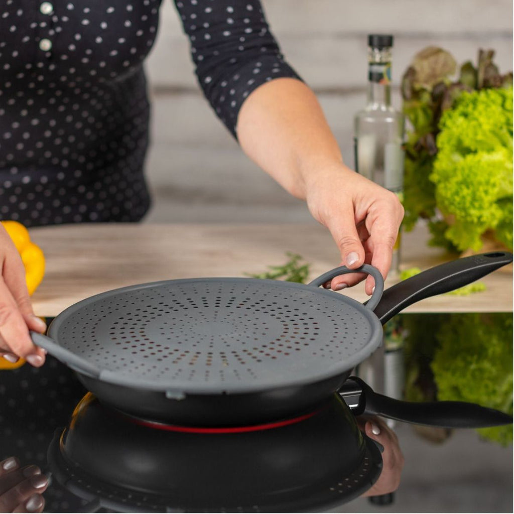 Podrás utilizarla con tus ollas, cacerolas, cazos, moldes y sartenes. Si quieres escurrir, no tienes más que colocarla sobre la olla o el pote y verter el agua con comodidad; sus agujeros harán de ella un perfecto colador. Para evitar que el aceite salpique, ponla sobre la sartén y ¡olvídate de limpiar las salpicaduras de aceite de la encimera!