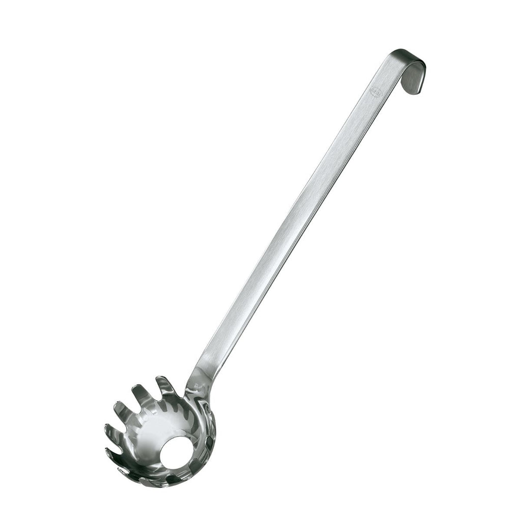 La Cuchara para pasta de acero inoxidable de gancho Rösle será tu mejor ayudante para servir los espaguetis o emplatar los tallarines que acabas de cocinar. Fabricada en acero inoxidable en una sola pieza, captura la pasta y escurre el agua de la cocción de la forma más limpia, fácil y cómoda que imagines. Robusta, duradera y resistente incluso al calor, esta cuchara de inox de diseño dentado es la mejor compañera los días que toca pasta para comer.