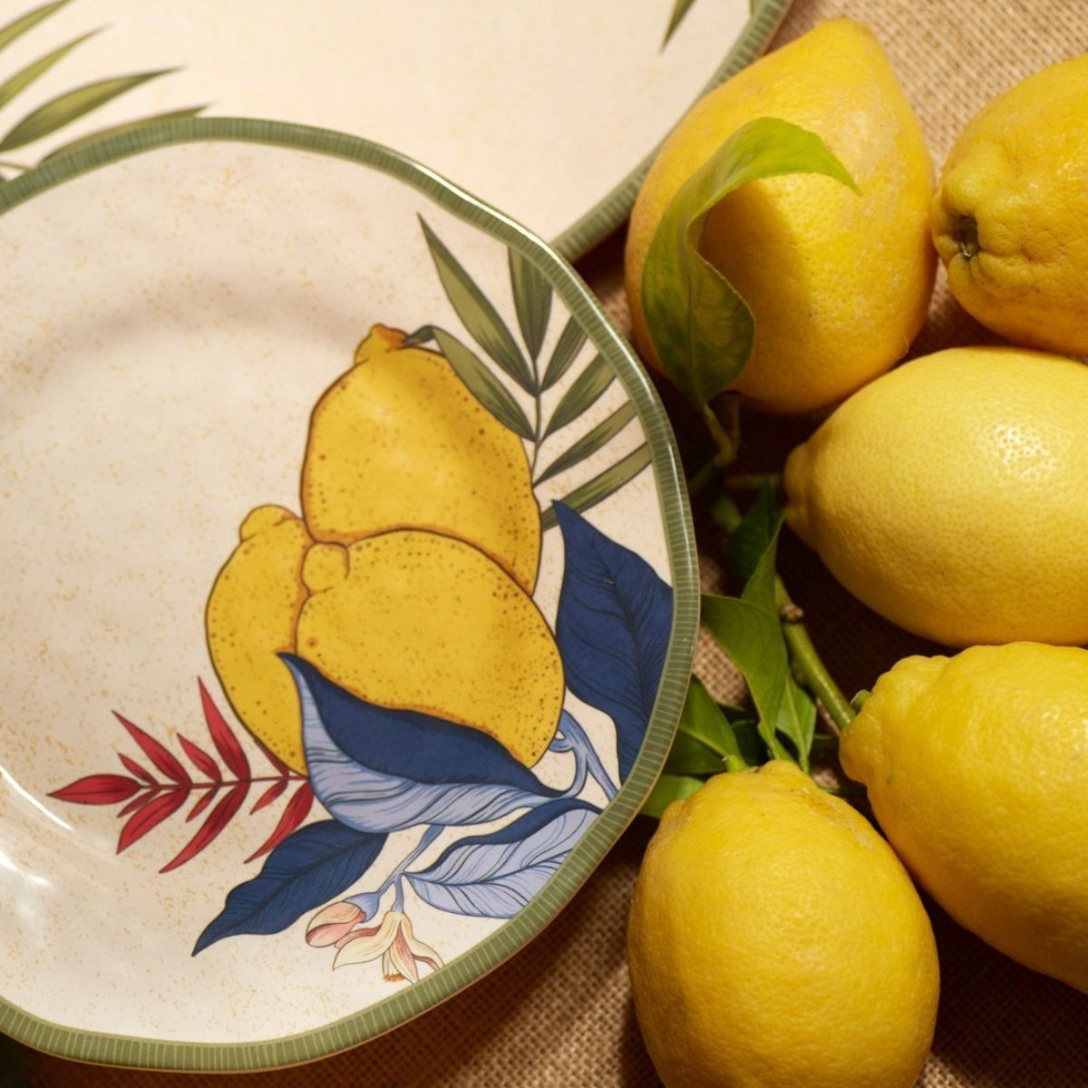 El set de 2 platos de postre de melamina forma parte de la colección Limù, inspirada en el universo de los cítricos mediterráneos. Con una estética fresca y muy luminosa que transmite una sensación muy veraniega, presenta coloridas ilustraciones estampadas de limones con hojas y ramas sobre un fondo claro.