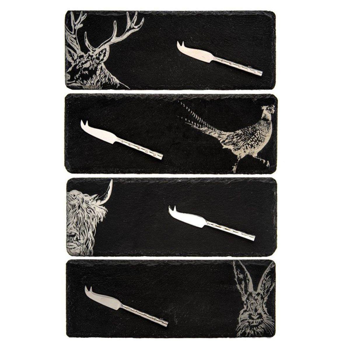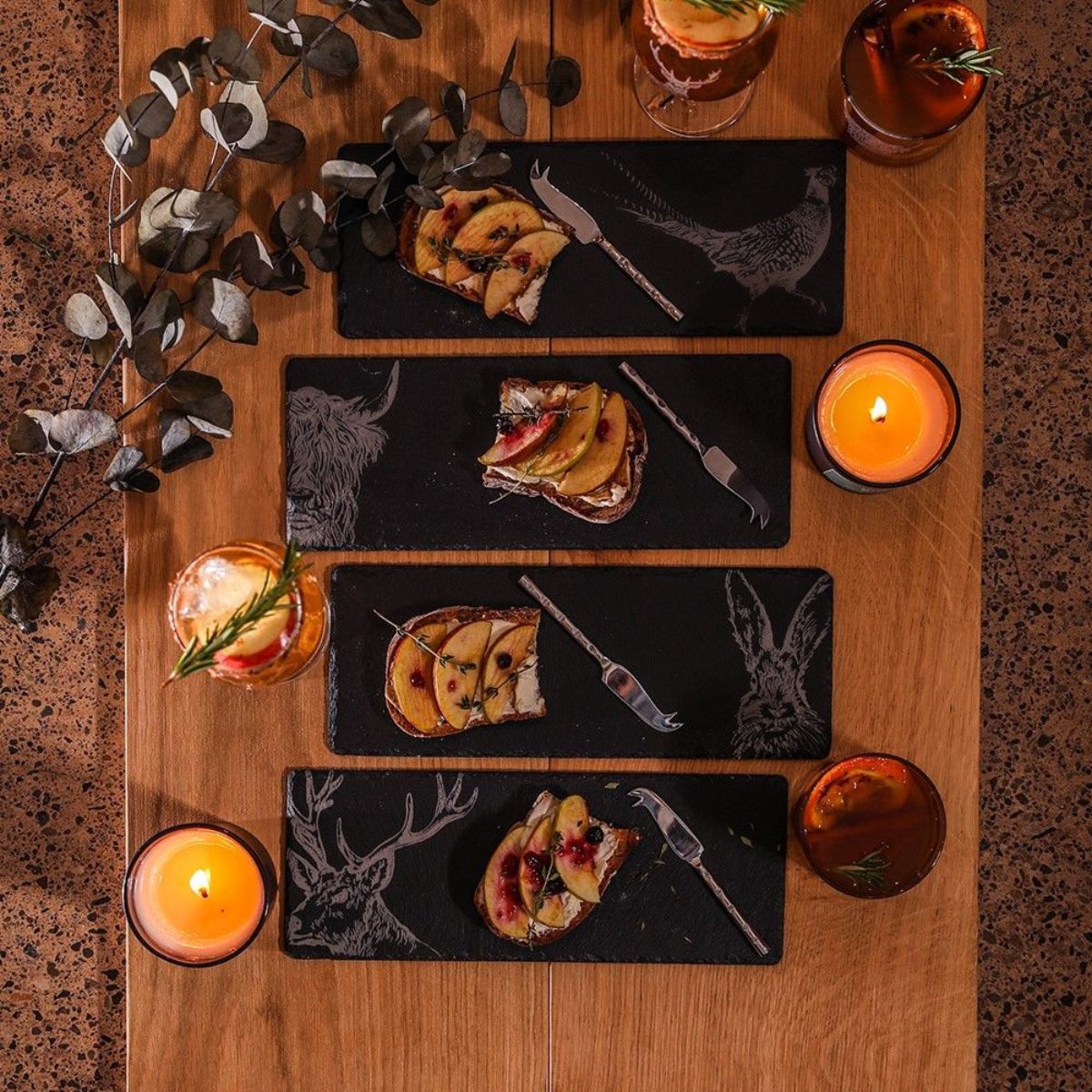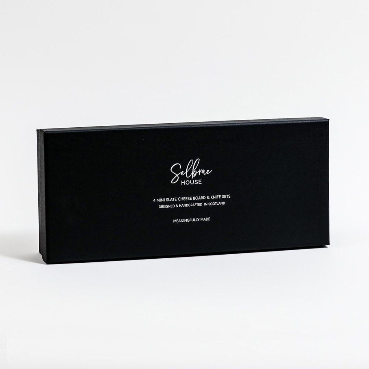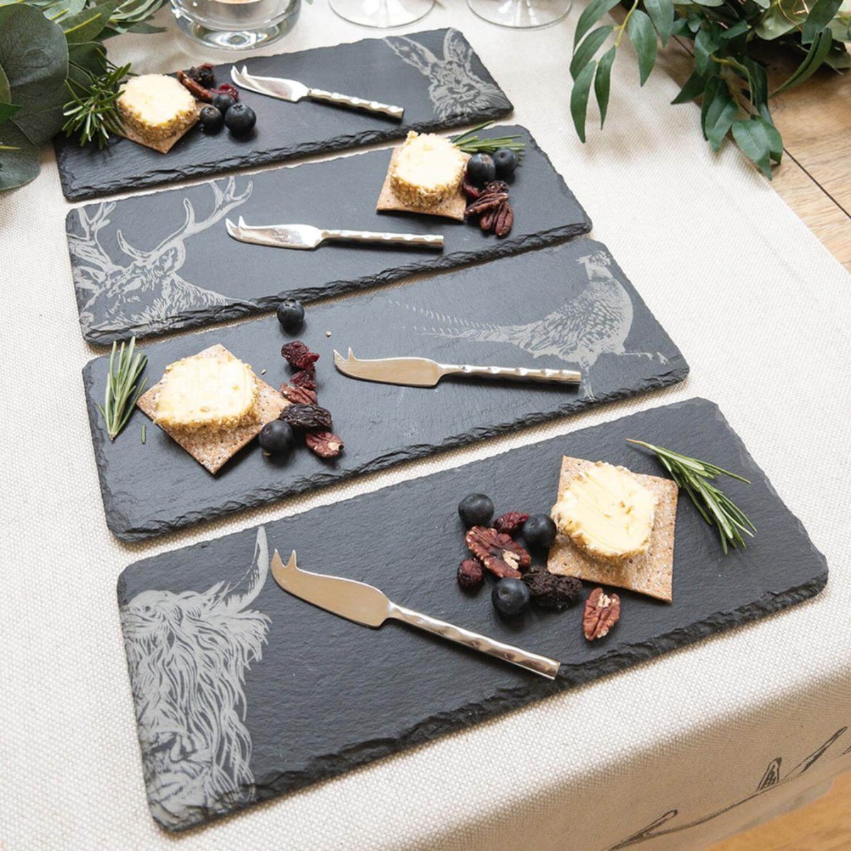 Este Set de 4 mini tablas de pizarra y cuchillos para queso Selbrae es una maravilla. Fíjate bien en todos sus detalles, porque te va a enamorar por completo. El juego se presenta en una elegante caja negra y está formado por 4 tablas de pizarra individuales y 4 cuchillos para queso de acero inoxidable. Las tablas están hechas a mano con pizarra natural, con el encantador grabado de un animal rural distinto en cada una. Un set de gran calidad y versatilidad, ideal para presentar quesos, canapés, patés, entrantes, aperitivos o postres. Perfecto para tu mesa y para regalar.
