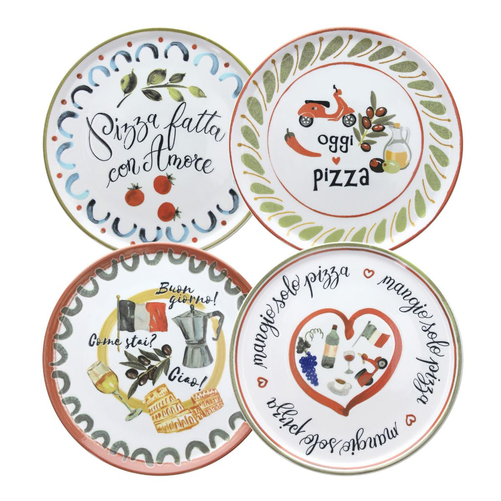 Tus mejores pizzas merecen la mejor presentación. Y este Set de 4 platos de porcelana para pizza Cinzia Andrea Fontebasso Tognana es una opción perfecta para convertir los momentos alrededor de una pizza en las ocasiones más especiales. Si tu pizza casera conquista todos los paladares, con este alegre conjunto de 4 platos hechos en Italia vas a conquistar también miradas y corazones.
