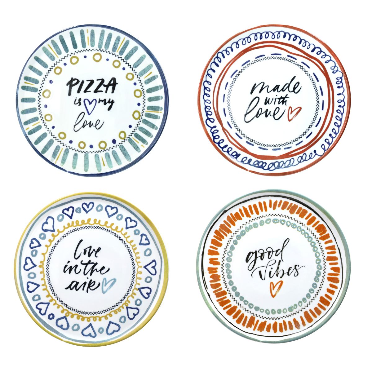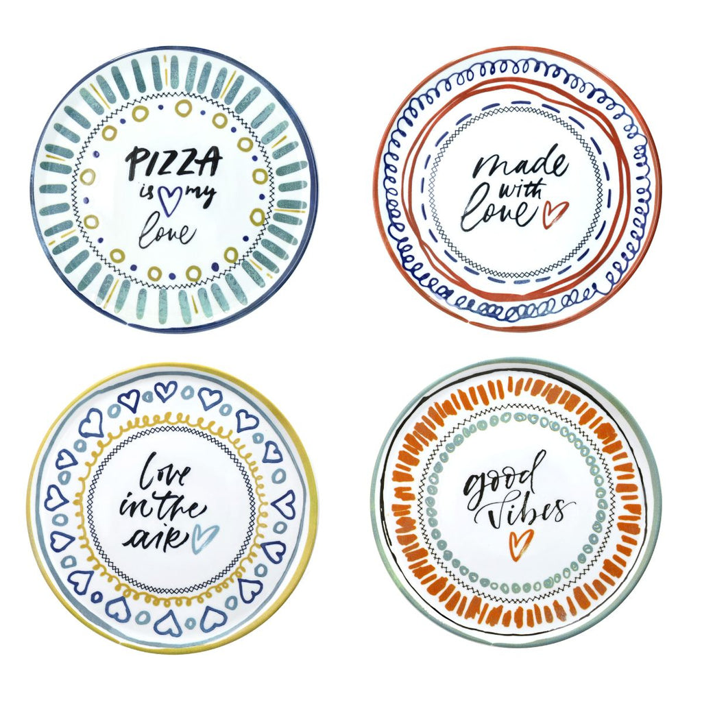 Andrea Fontebasso es la marca más premium de la popular casa italiana Tognana, y estos 4 platos de porcelana de primera calidad son una auténtica declaración de amor a uno de los emblemas nacionales de Italia: la pizza. Cada plato presenta un diseño distinto, alegre y lleno de amor, porque no hay nada mejor que disfrutar una buena pizza en compañía.