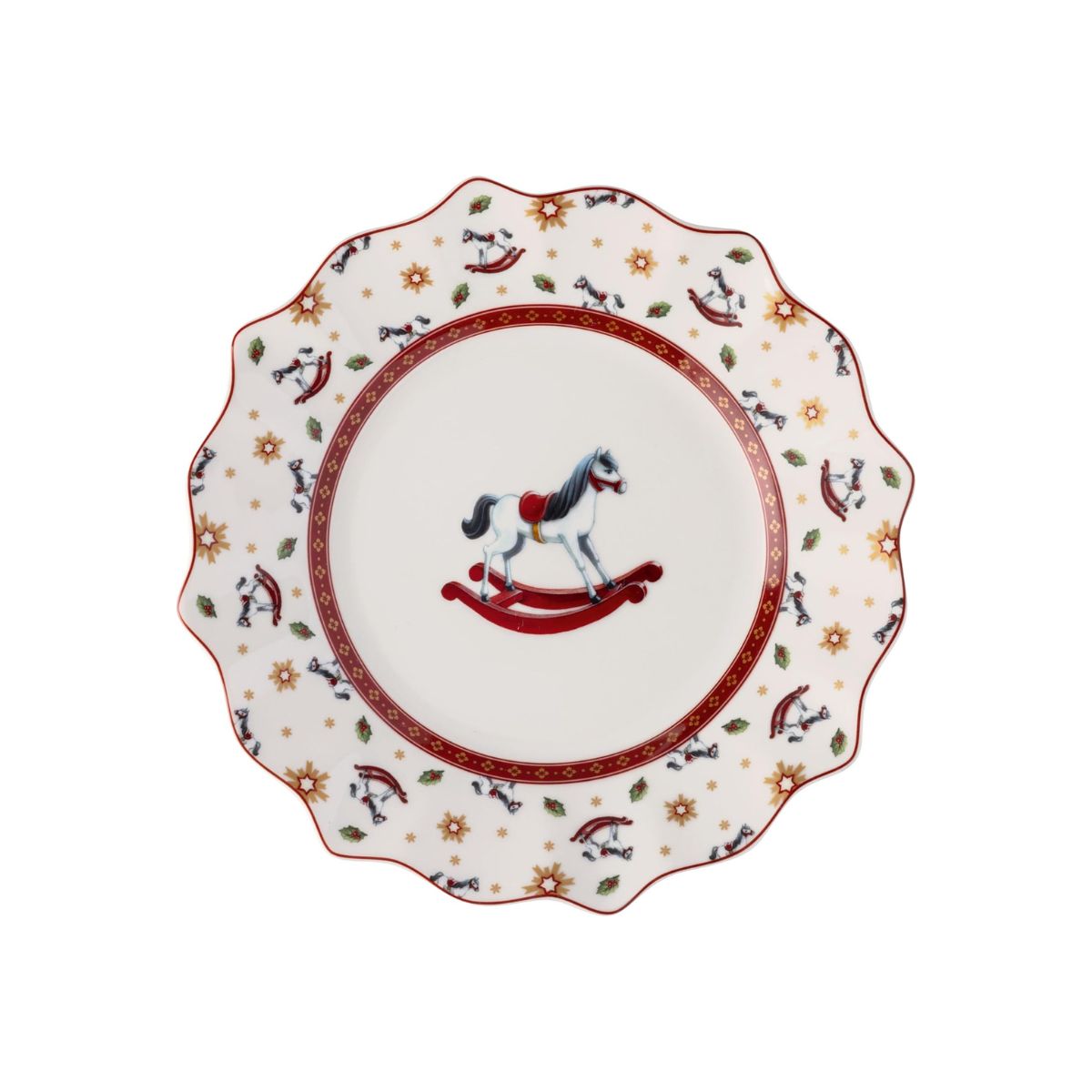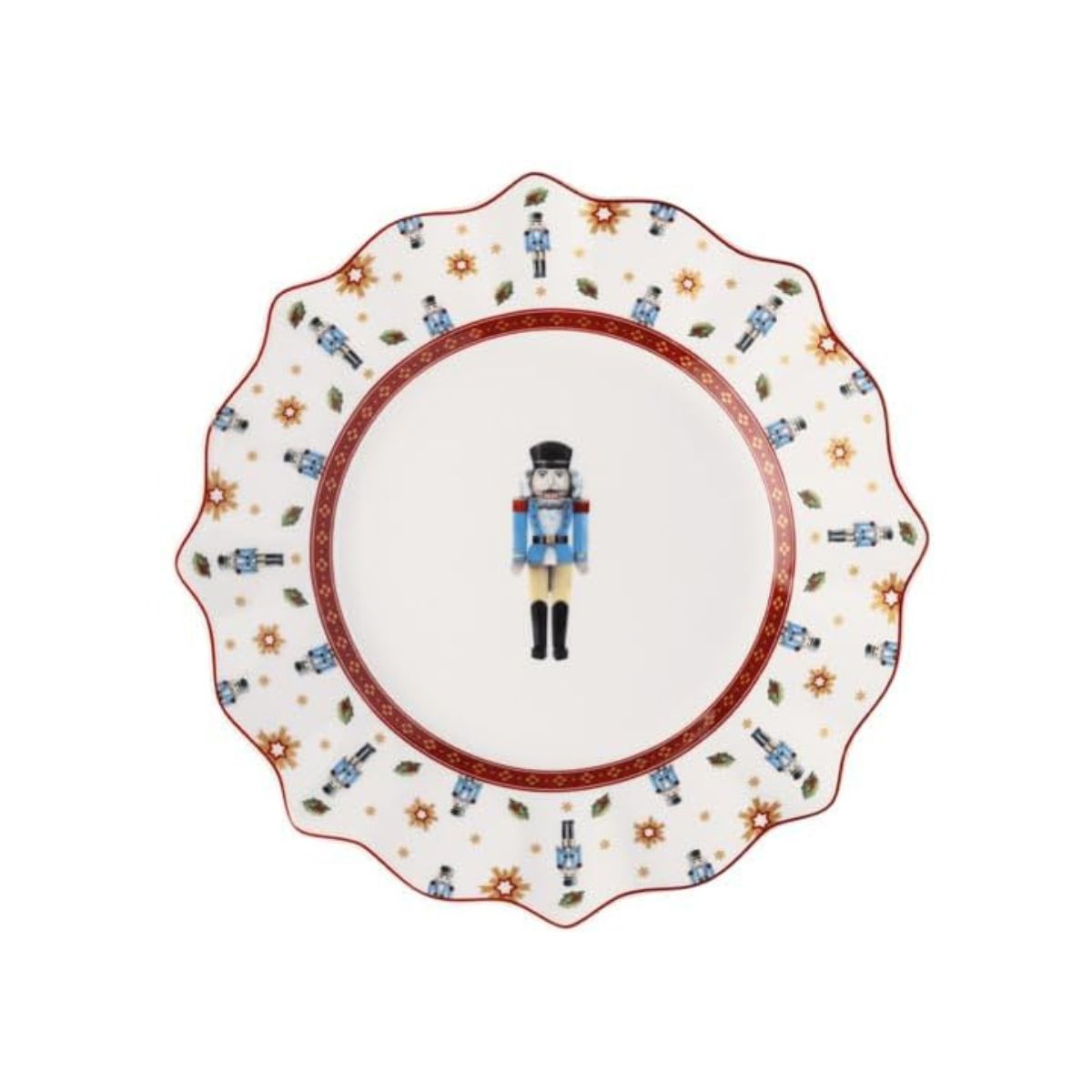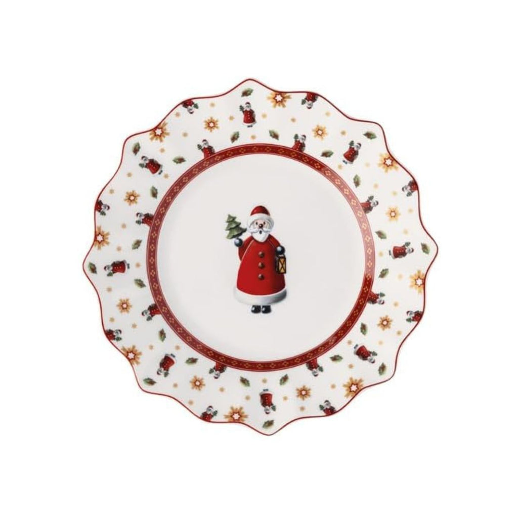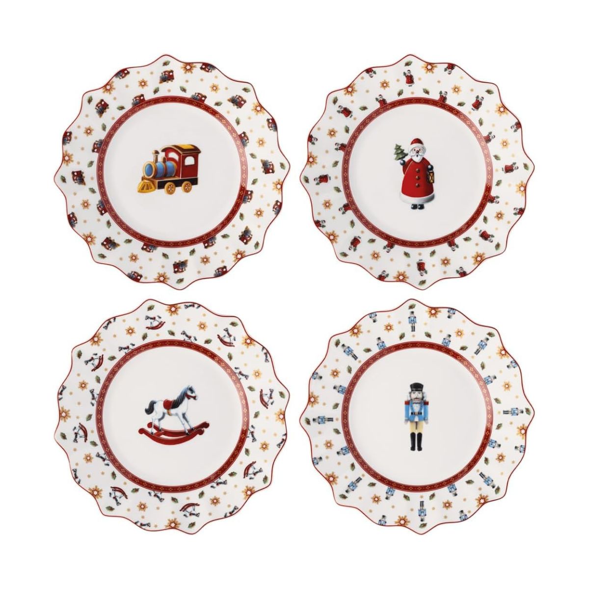 Con el Set de 4 platos de porcelana Toy's Delight Villeroy & Boch, tu mesa se llenará de la magia y la ilusión navideñas. Este juego de 4 platos llanos de porcelana prémium te va a enamorar con su excelente calidad y su exquisito diseño. Cada plato está dedicado a uno de los juguetes clásicos que inspiran la colección Toy's Delight. Un tren de vapor, un caballo balancín, un soldado Cascanueces o un muñeco de Papa Noel destacan en el centro del plato, enmarcados por un círculo rojo y una colorida cenefa con motivos del mismo juguete. ¡Una absoluta obra de arte!