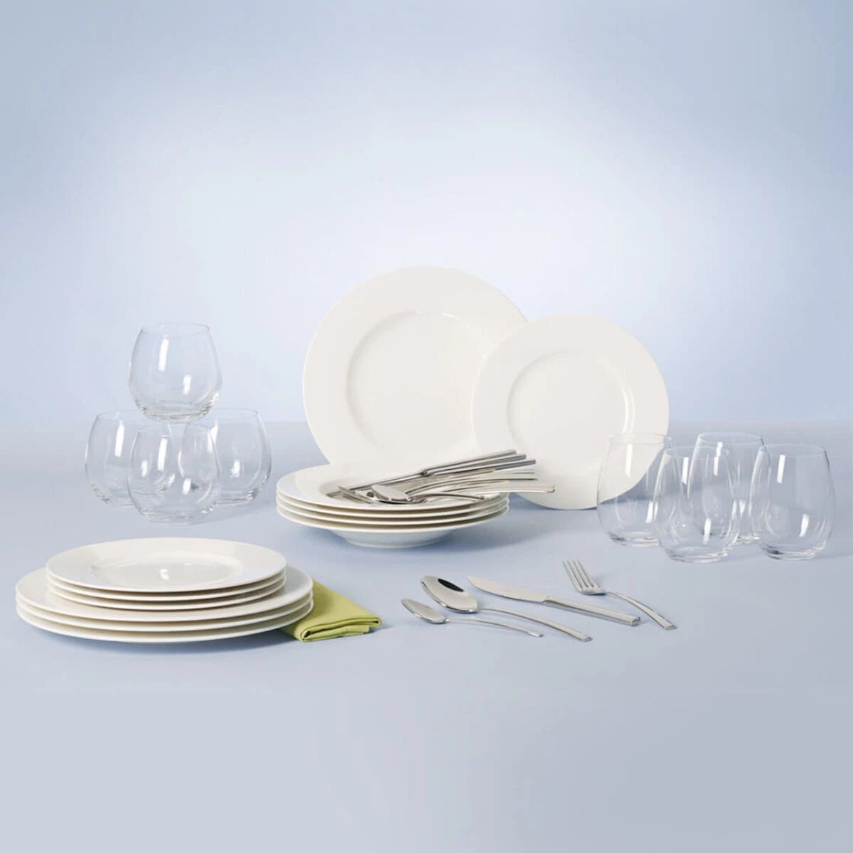 La Vajilla de 36 piezas World White Villeroy & Boch es un completo set de 4 servicios, ideal para lucir en tu mesa. La vajilla incluye platos, vasos y cubiertos de excelente calidad y para 4 personas. Las piezas están fabricadas con los mejores materiales. Los platos de porcelana premium de color blanco puro, los vasos de cristal de gran transparencia y resistencia, y los elegantes cubiertos de acero inoxidable 18/10, hacen de este juego la vajilla perfecta para vestir tu mesa en cualquier ocasión. Presentado en una elegante caja, es un regalo ideal.