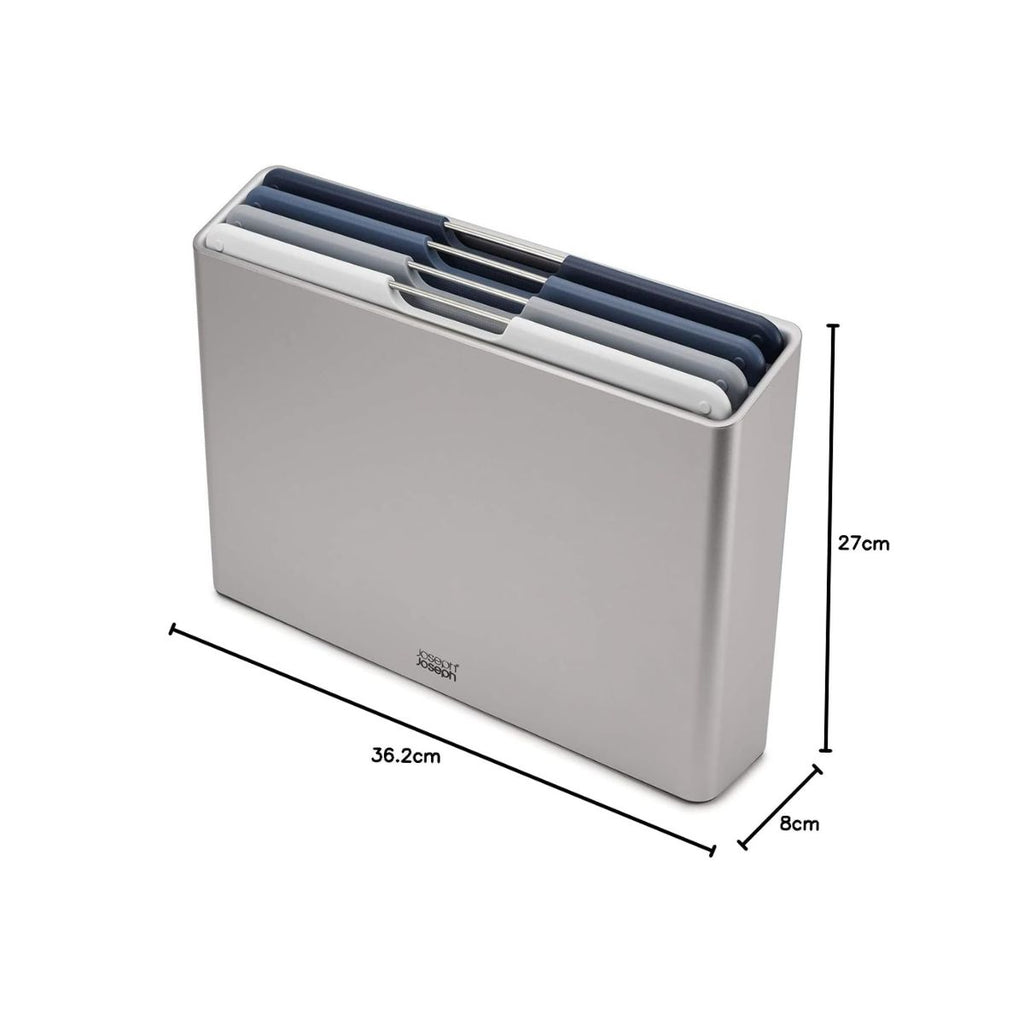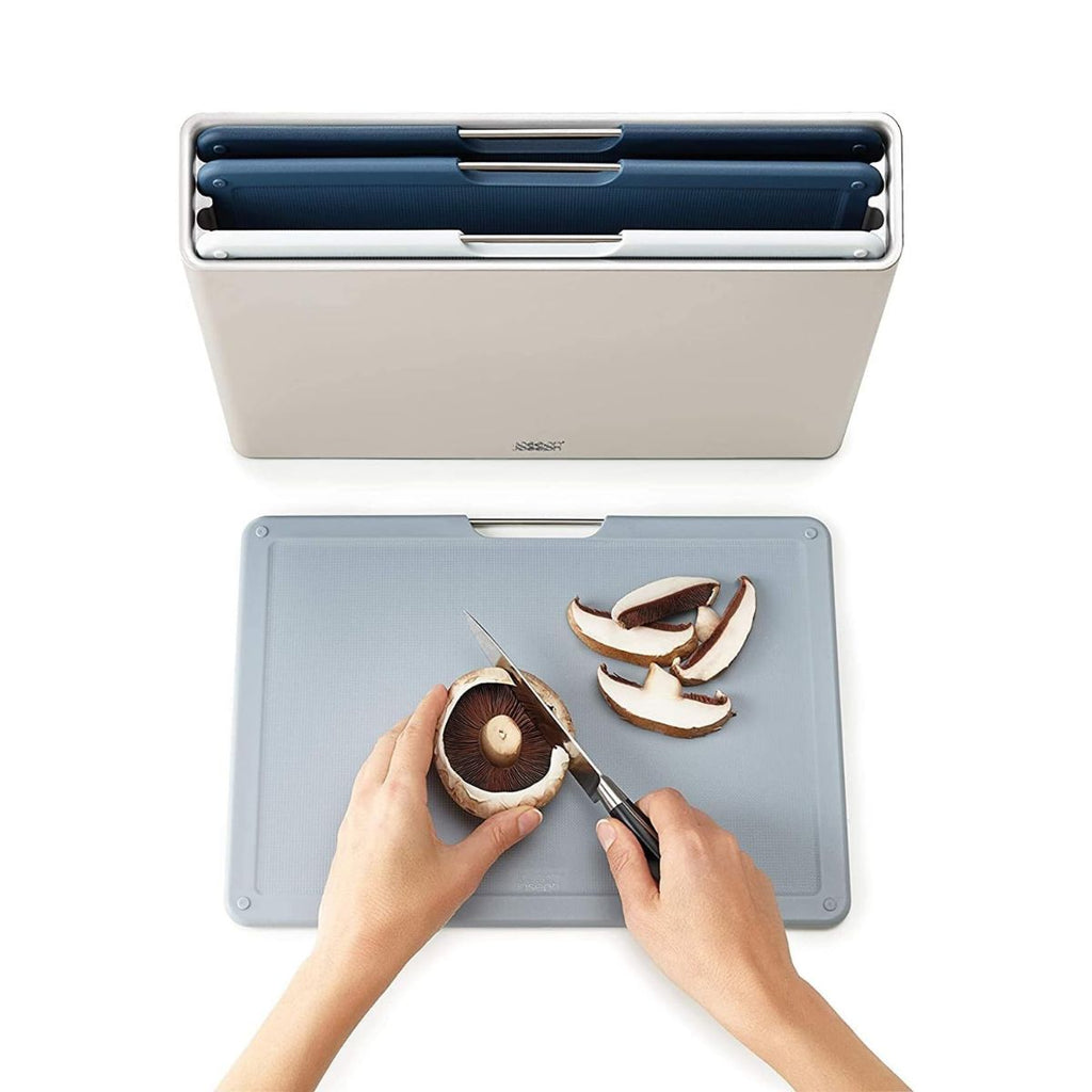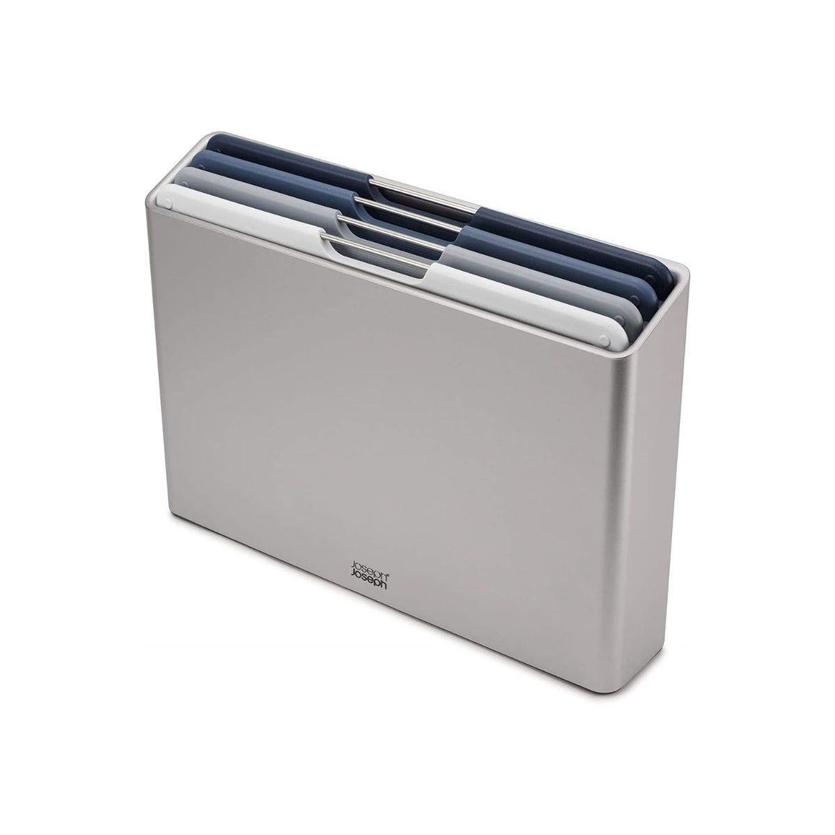 Moderno, práctico, elegante y de lo más funcional. Por todo ello, el Juego de 4 tablas grandes de cortar Folio Joseph Joseph se ha convertido en uno de los últimos grandes éxitos de la marca Joseph Joseph. Se trata de un set de 4 tablas de corte con estuche de almacenamiento, perfecto para tenerlas siempre ordenadas y en su sitio. Las 4 tablas son de distinto color y cuentan con base antideslizante. Disponen de superficie de corte texturizada en ambas caras para mantener a salvo el filo de tus cuchillos. Un set indispensable en la cocina, con el que podrás elegir un color para cada tipo de alimento.