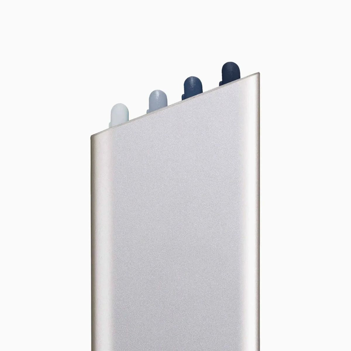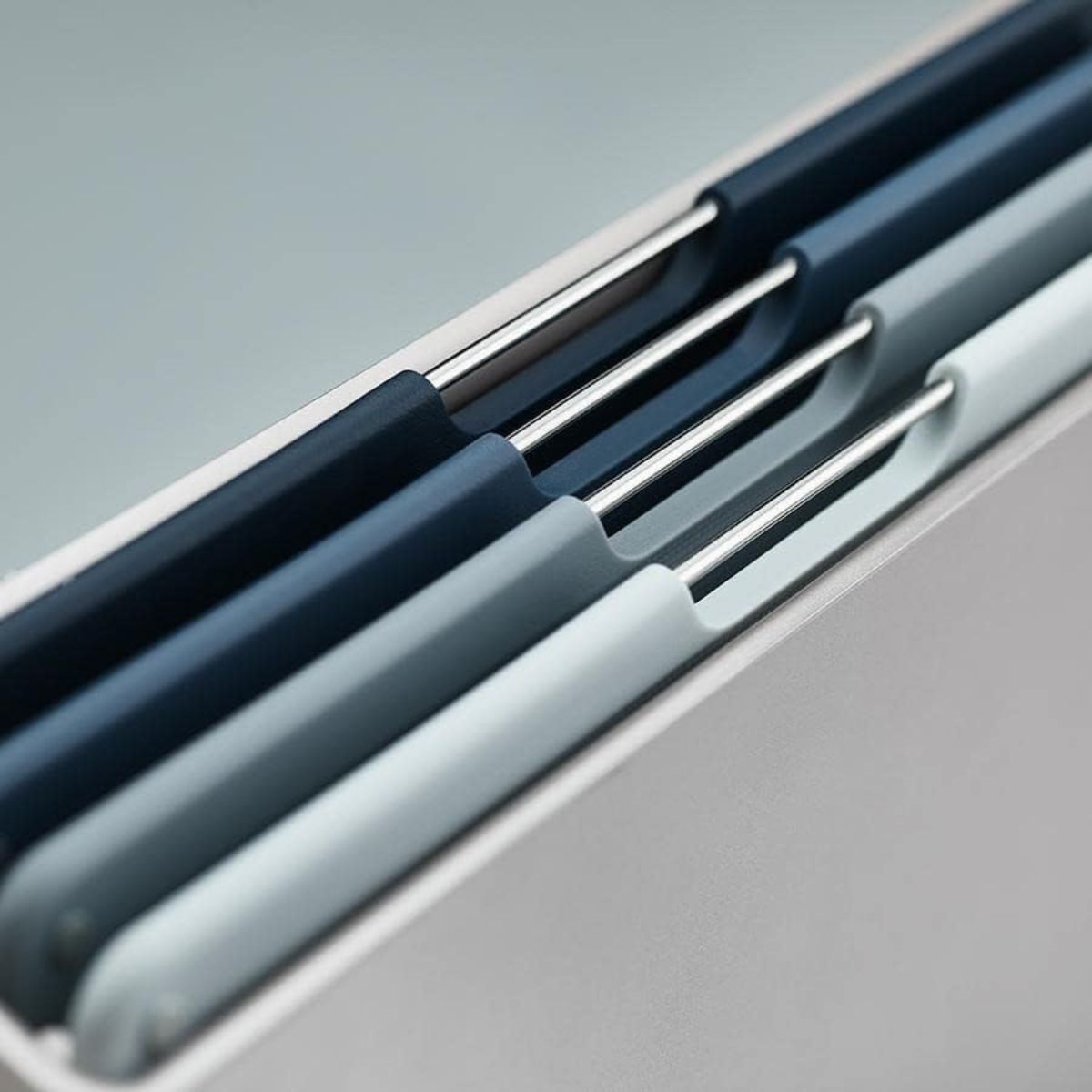 El estuche del set destaca por su diseño inteligente escalonado, que permite ver en todo momento las tablas. Al ser cada una de un color, podrás seleccionar fácilmente la que necesites. Además, cada tabla cuenta con una barra de sujeción de acero inoxidable, para que puedas coger fácilmente la que quieras usar. El estuche mantiene las tablas separadas, permitiendo que el aire circule y su base antideslizante lo mantendrá siempre en su sitio.