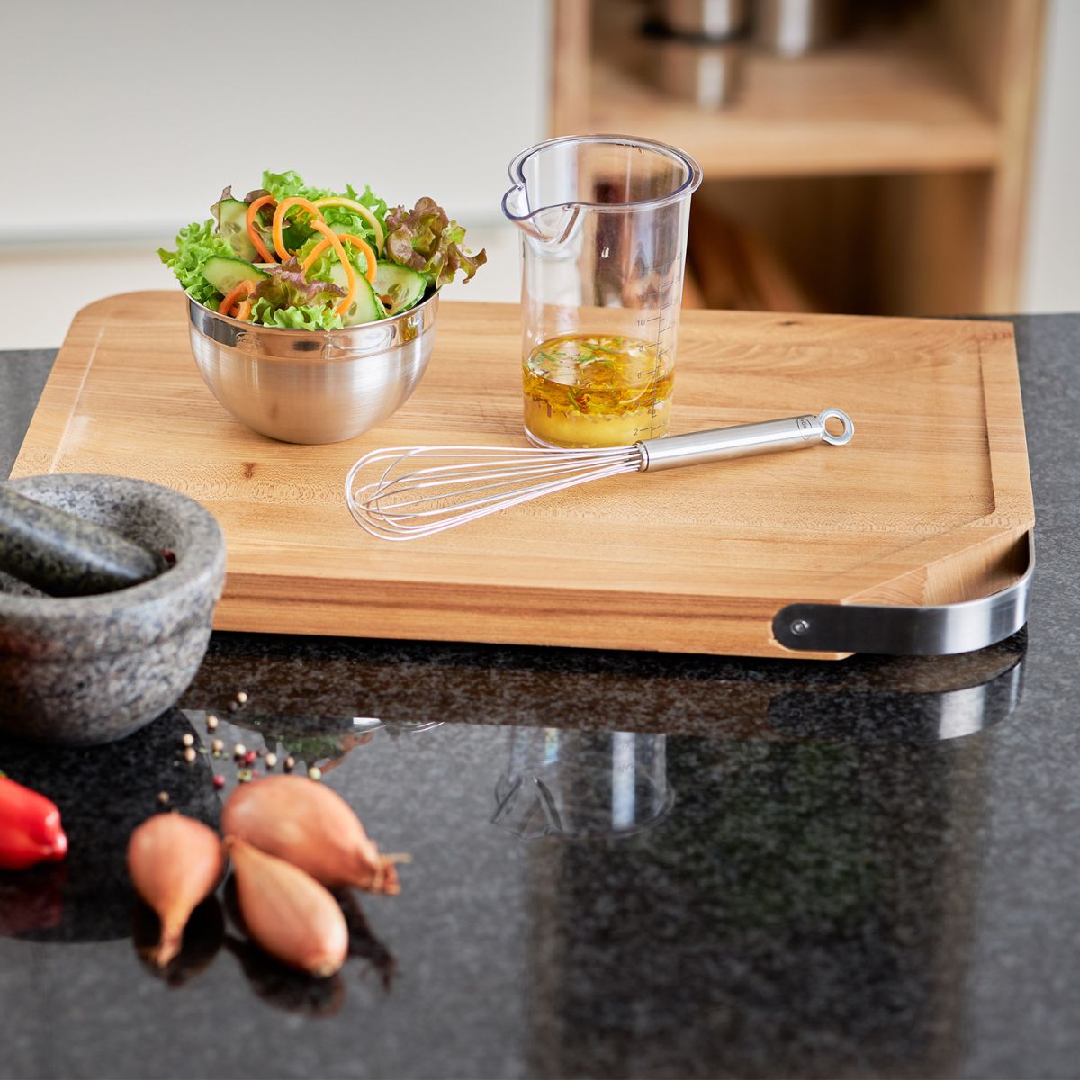 Robusta y elegante, la Tabla de cortar de madera de olmo con mango de inox Rösle ofrece el equilibrio perfecto entre resistencia y facilidad de uso. Un imprescindible en la cocina de alta calidad, con un diseño inclinado muy funcional, ideal para cortar todo tipo de alimentos con gran higiene, comodidad y seguridad. Su asa de inox es perfecta para colgarla o llevarla a la mesa como bandeja, para presentar un surtido de embutidos, quesos, patés, bizcochos o la bollería del desayuno.