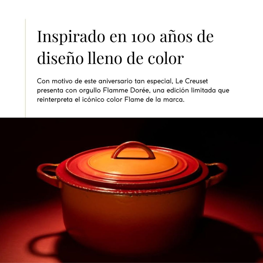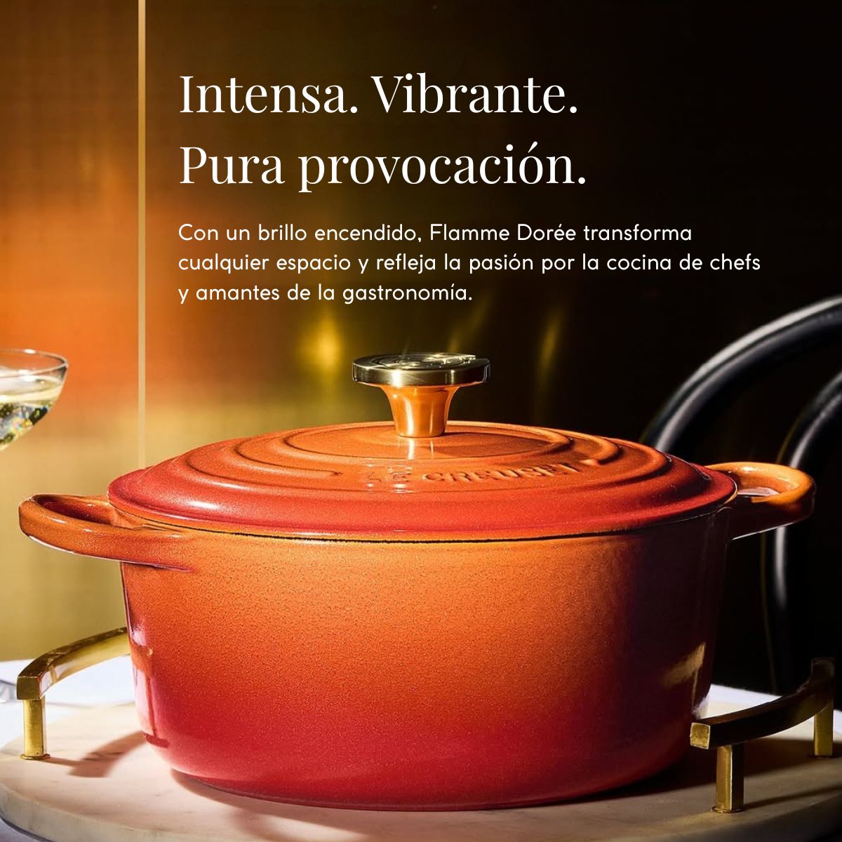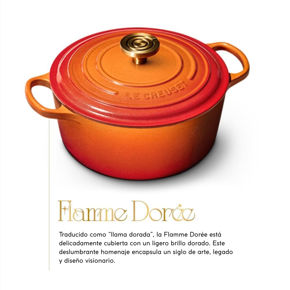 Inspirada en sus orígenes ardientes, y con todo el brillo del Centenario, el color volcánico de la primera cocotte de hierro fundido de Le Creuset, se transforma en el elegante Flame Dorée, para conmemorar los 100 años de la marca, en una Edición Especial Limitada del 100 aniversario de Le Creuset. La combinación del vibrante acabado con partículas de oro con el exclusivo pomo Crisol, hace de esta cocotte premium todo un símbolo de estilo, de pasión culinaria y de "joie de vivre".
