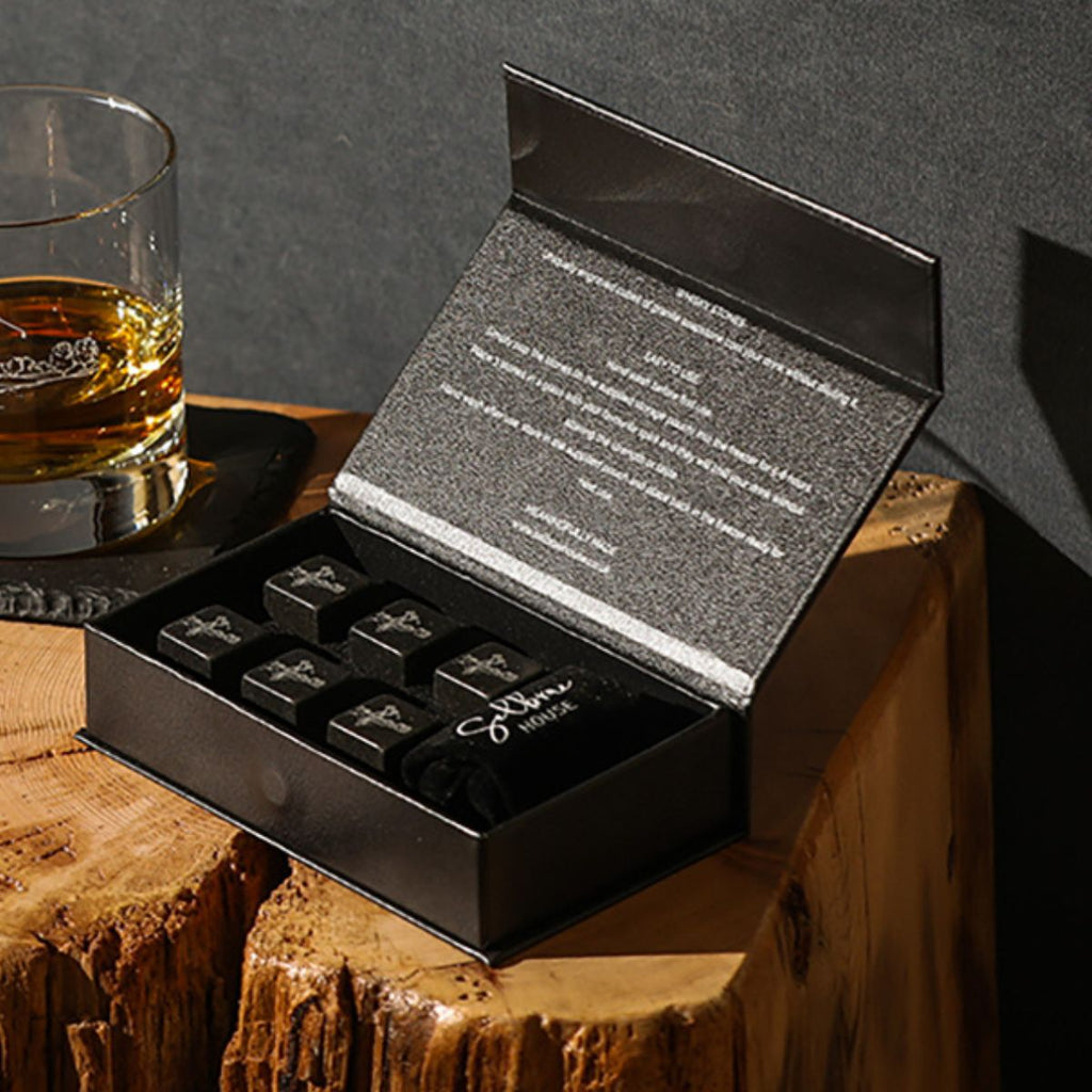 Los cubitos son aptos para su uso alimentario. Cuando quieras enfriarlos, tan solo has de ponerlos en el congelador durante 5 o 6 horas, dentro de su bolsa de terciopelo. La esteatita de granito se enfriará en el congelador, absorbiendo el frío. Pon los cubitos que precises en el vaso, junto con tu bebida, el whisky o el licor elegido, y las piedras enfriarán lentamente la bebida, sin aguarla ni diluirse