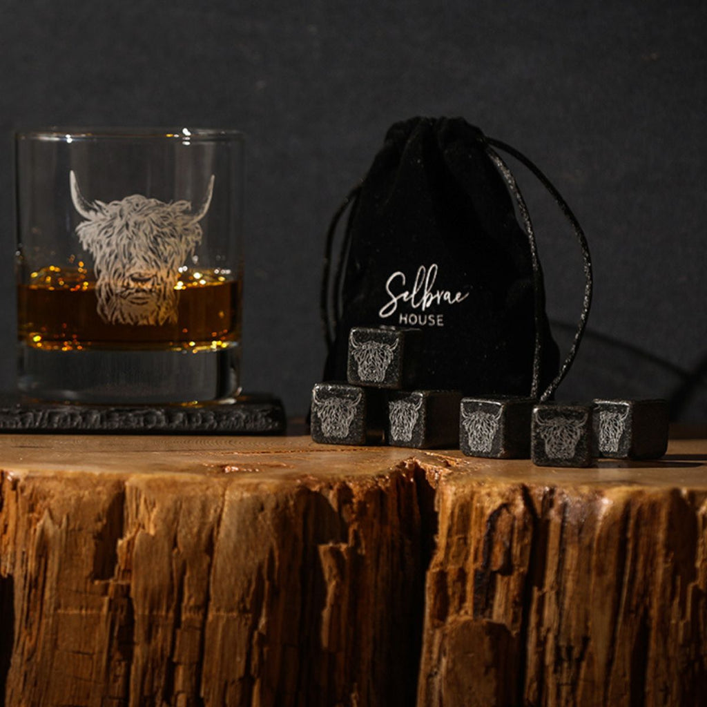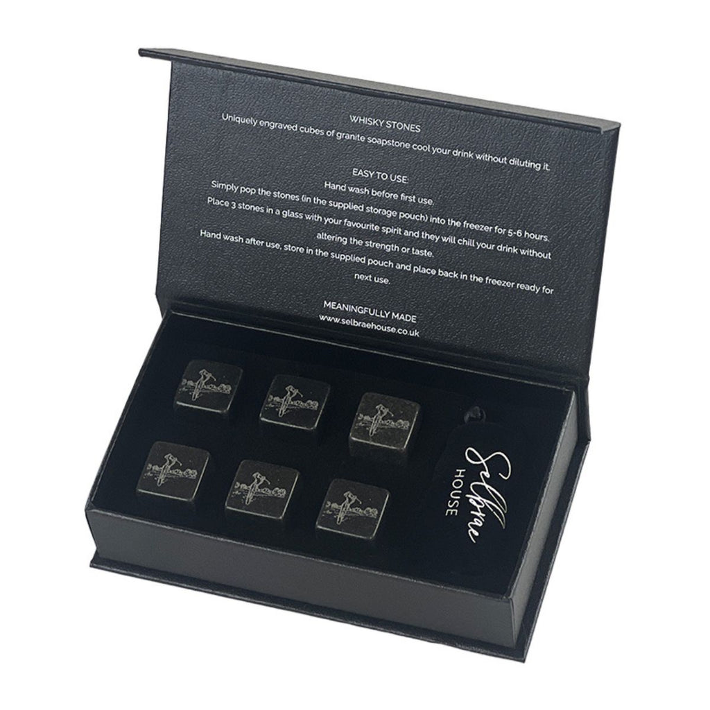 El Set de 6 cubitos de piedra con funda Selbrae es el perfecto compañero para enfriar tus bebidas sin aguarlas ni diluirse. Este juego de 6 piedras de whisky está fabricado en Escocia e incluye una funda de terciopelo para guardarlas y enfriarlas. Elegantes, funcionales e infinitamente reutilizables, los 6 cubitos de esteatita de granito presentan un original grabado con la silueta de una imagen emblemática escocesa. Su presentación en elegante caja, lo convierte en un regalo perfecto para ti o para quien tú quieras.