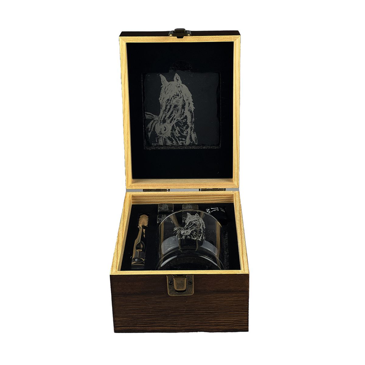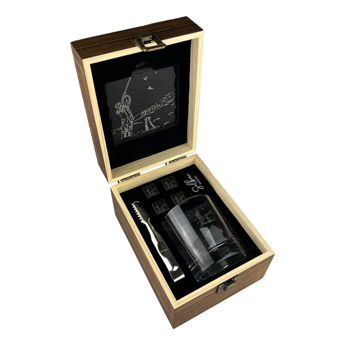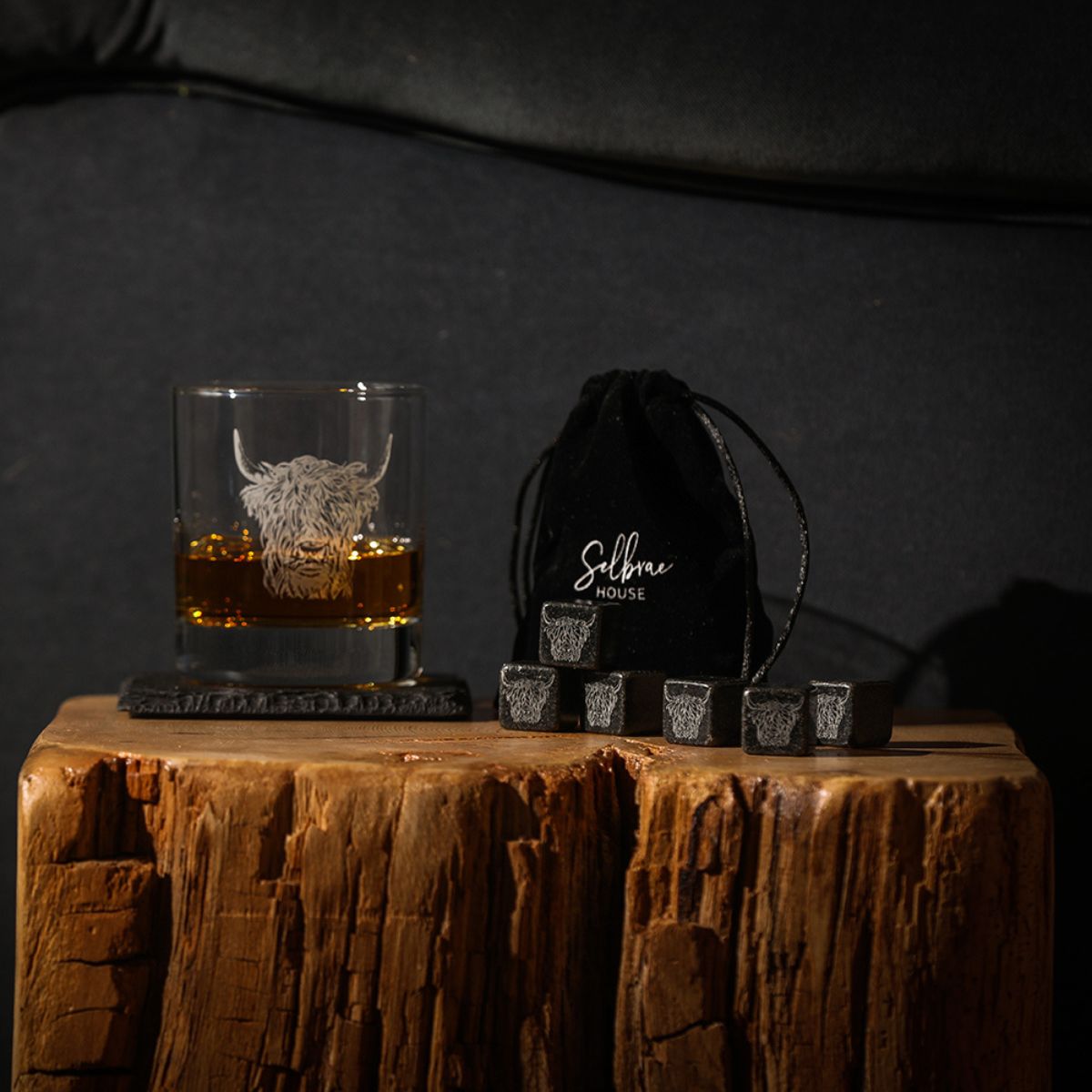 El vaso de vidrio, el posavasos de pizarra y los cubitos de granito están grabados con la silueta de una imagen emblemática de Escocia. Podrás elegir el que más te guste o el que prefieras regalar, desde la vaca de los Highlands, al cazador, el caballo o el jugador de golf (deporte tradicionalmente escocés). Sea cual sea el modelo elegido, es un completo set al que no le falta detalle y que rebosa elegancia en cada pieza.