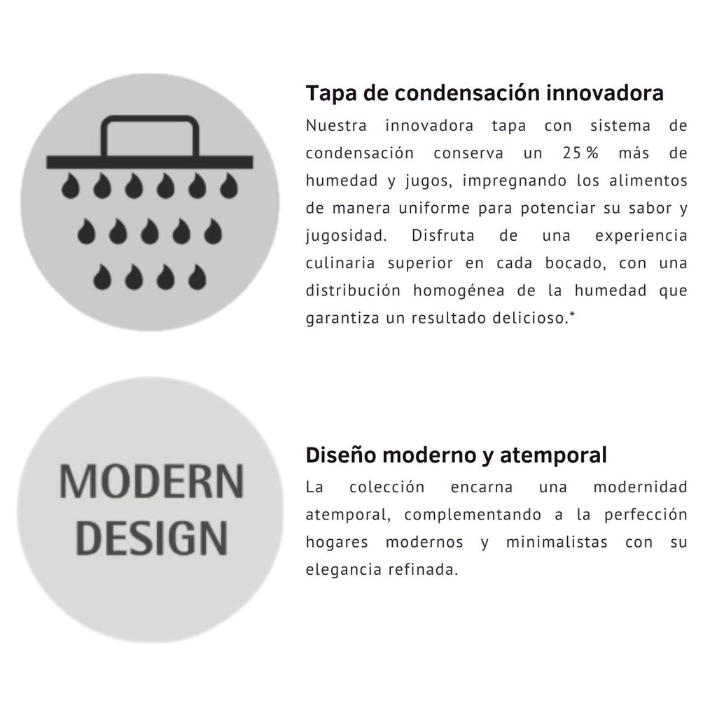 - Su tapa de condensación garantiza unos resultados más tiernos, jugosos y sabrosos.