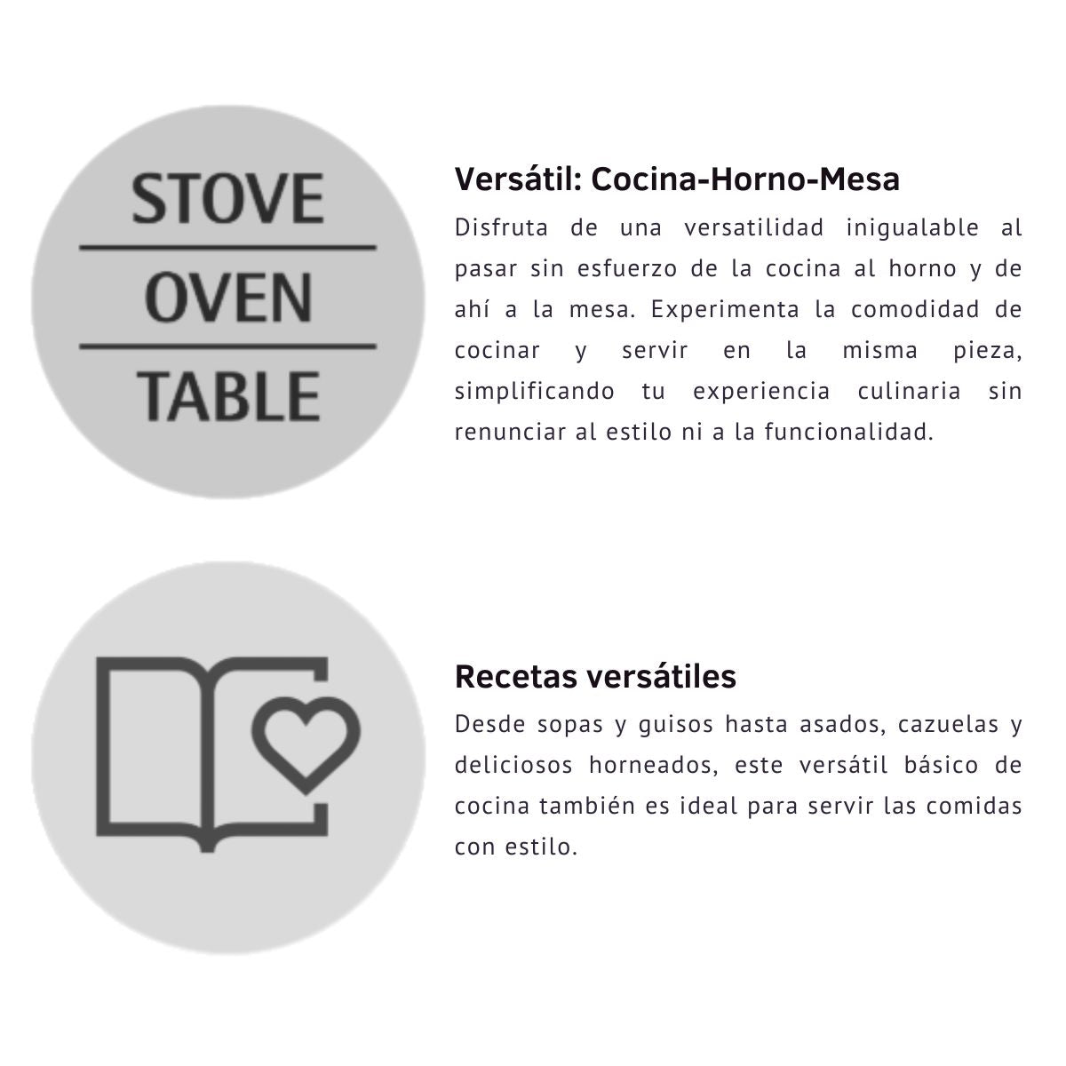 - Es apta para todo tipo de cocinas, incluida inducción. También es apta para su uso en el horno, hasta 250 °C. Esto la hace muy funcional, ya que podrás empezar cocinando tus recetas en el fuego y, si lo requieren, acabarlas en el horno sin tener que cambiar de utensilio.