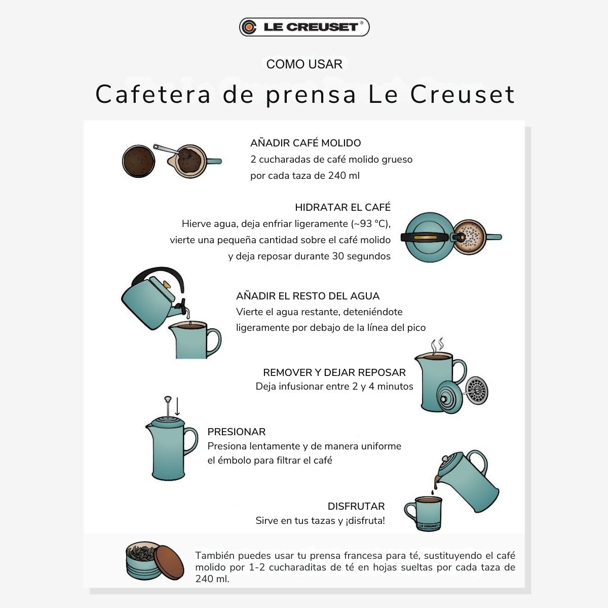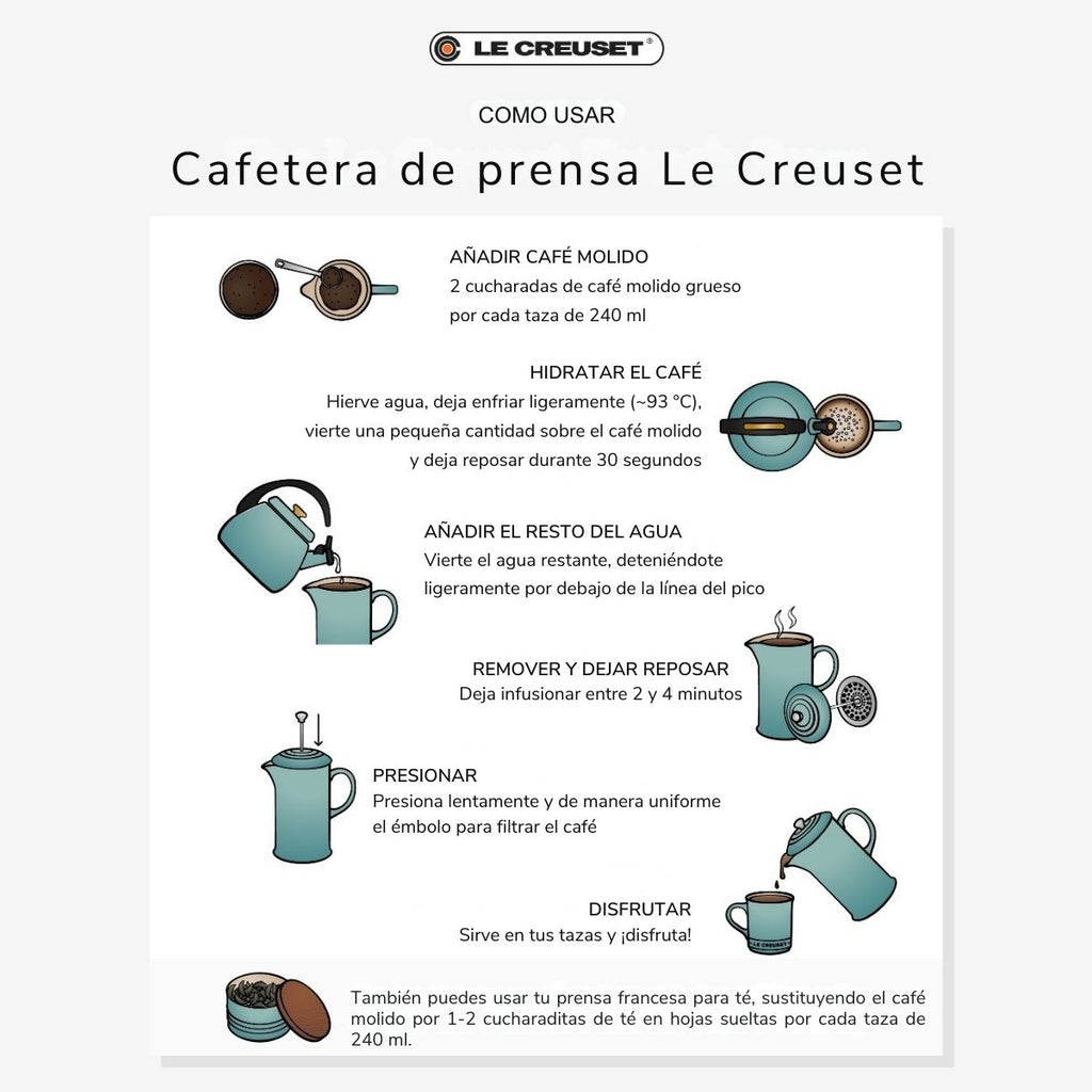 Die Le Creuset Kaffeebereiter besteht aus Steinzeug mit einer Metallpresse. Es ist eine ideale Kaffeebereiter, um einen Kaffee zuzubereiten, der sein ganzes Aroma behält, ohne andere Aromen oder Gerüche zu absorbieren und jeden Schluck ohne Eile zu genießen.