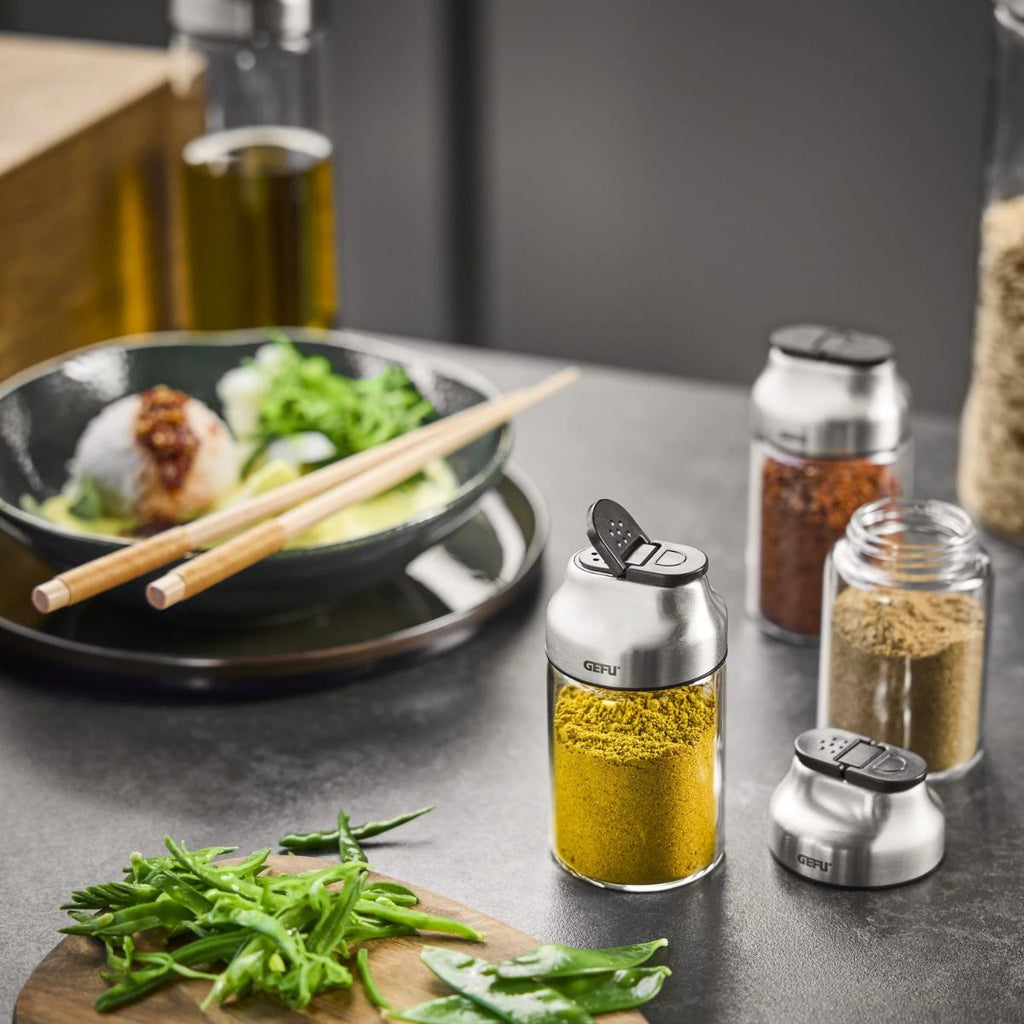 Das Gewürzglas Kippo Gefu ist die eleganteste und praktischste Art, deine Lieblingsgewürze und Kräuter aufzubewahren und zu dosieren. Hergestellt aus Borosilikatglas und Edelstahl, besticht es durch seine Robustheit, Transparenz und modernes Design, das es dir ermöglicht, den Inhalt leicht zu sehen und deine Gewürze stets perfekt organisiert und griffbereit zu halten.Jedes Glas ist so gestaltet, dass es im Küchenalltag maximalen Komfort bietet. Der Deckel mit doppelter Öffnung erlaubt dir, je nach Textur des Gewürzes oder benötigter Menge zwischen Streuen
